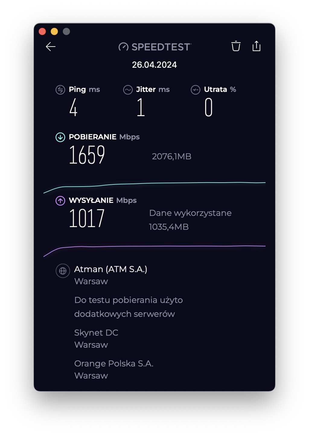 W niektórych testowanych przeze mnie komputerach znajduje się czasem łącze Ethernet 10 Gbe, czyli o przepustowości 10 Gb/s i dokładnie taki port można znaleźć w routerze Funbox 10. Po podłączeniu urządzeń – dzięki kabla Ethernet Cat6 internet – w sprzętach, takich jak Mac Studio od Apple’a działa jak rakieta. Wąskim gardłem, jeżeli już takowe się pojawi, okazują się czasem… serwery.