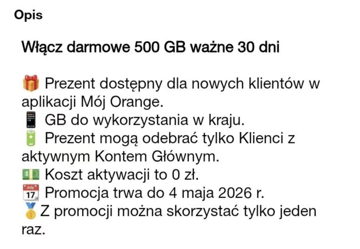Ze zrzutów ekranu udostępnianych przez użytkowników Pepper wynika, iż darmowa paczka 500 GB ma być dostępna do 4 maja 2026 r. Odbierzemy ją zatem do poniedziałku kończącego weekend majowy.