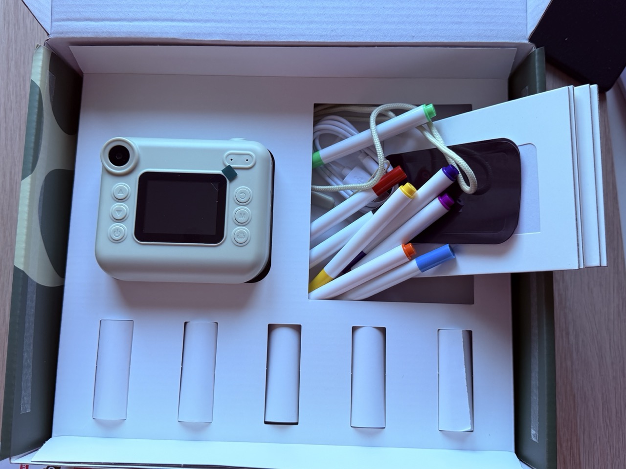 Aparat natychmiastowy Vision wyróżnia się bogatym wyposażeniem, bo w pudełku znajdziemy aż 20 elementów. Są to między innymi naklejki, kolorowe markery, ramki na zdjęcia, małe magnesy oraz pięć zapasowych rolek do drukowania. To brzmi imponująco, zwłaszcza w porównaniu z Instaxem Mini 12, gdzie w zestawie dostajemy zwykle tylko jedną rolkę papieru.