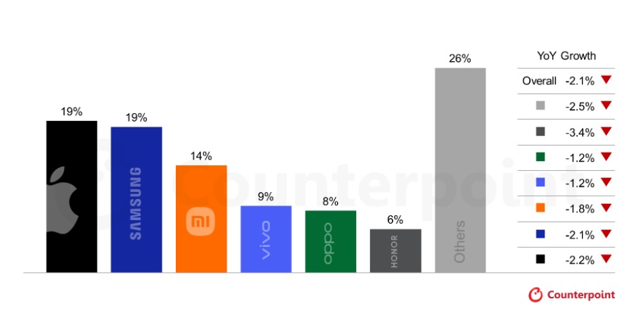 Apple i Samsung są w najlepszej pozycji, aby przetrwać kolejne kwartały. Ale innym, którzy nie mają aż tak dużego pola manewru w zarządzaniu udziałem w rynku a marżą zysku, będzie ciężko – starszy analityk Counterpoint, Yang Wang.