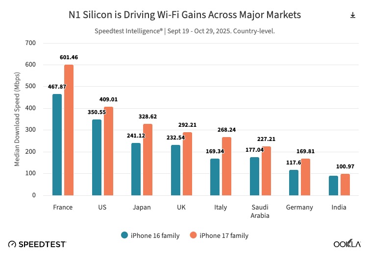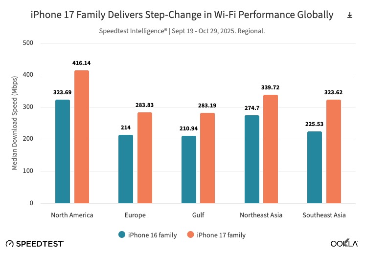 Firma Ookla odpowiadająca za serwis Speedtest.net opublikowała nowy raport, w którym porównano średnie prędkości transferu pobierania w kilku kluczowych regionach. Wykorzystano do tego dwie generacja iPhone’ów: 16 i 17. Różnice są ogromne – sięgają choćby 40 proc. na rzecz nowych modeli, chociaż oba korzystają z WiFi 7.
