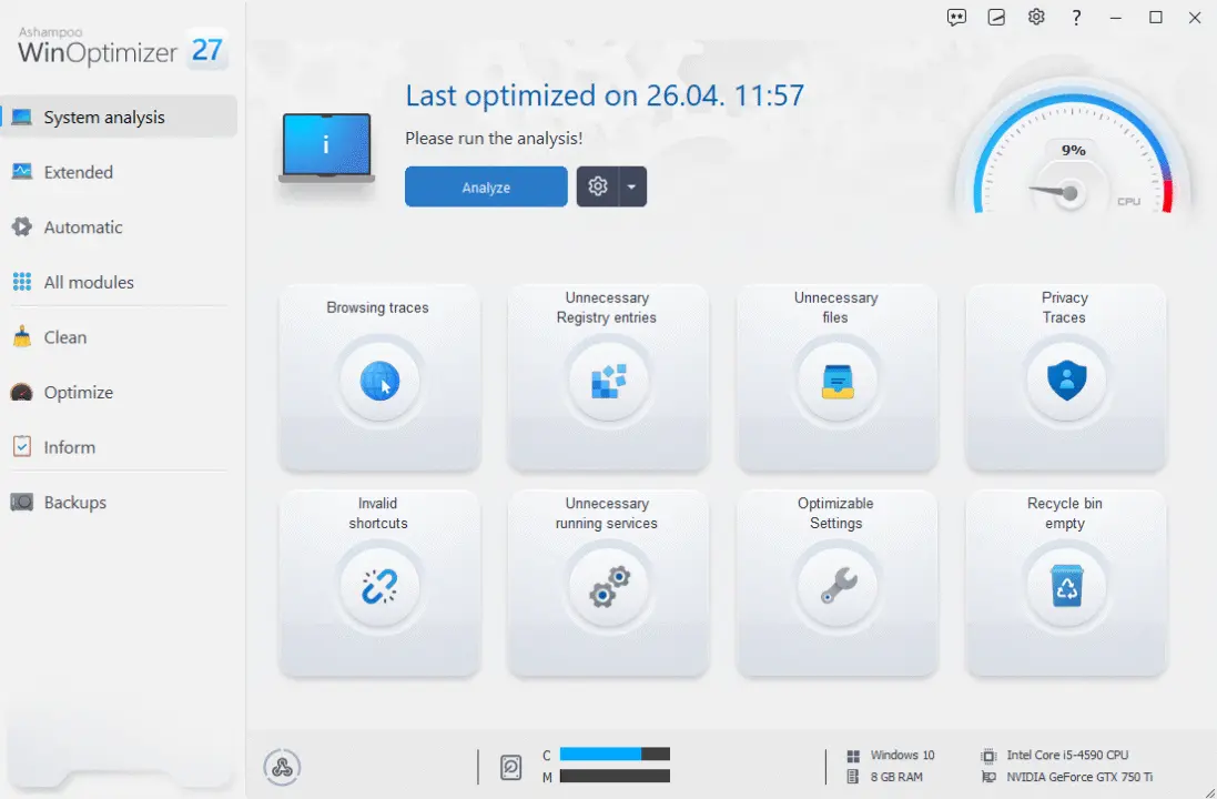 Ashampoo WinOptimizer 27 za darmo to przede wszystkim narzędzie do usuwania niepotrzebnych plików z dysku twardego. Pozbędziecie się śladów przeglądania, niepotrzebnych elementów rejestru, pustych folderów, starszych wersji systemu, statystyk użytkowania i nie tylko. gwałtownie też naprawicie problemy z wyświetlaniem gier za sprawą opróżnienia pamięci podręcznej modułu cieniującego.