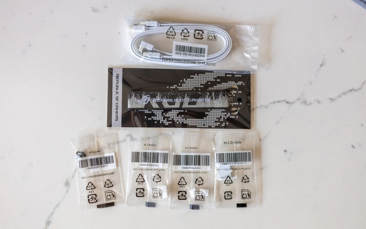 W zestawie z płytą główną ASUS oprócz instrukcji obsługi znajduje się zewnętrzna antena Wi-Fi, brelok do kluczy ROG, akcesoria montażowe dla dysków M.2, zaślepki dla złączy wentylatorów i opaski zaciskowe.