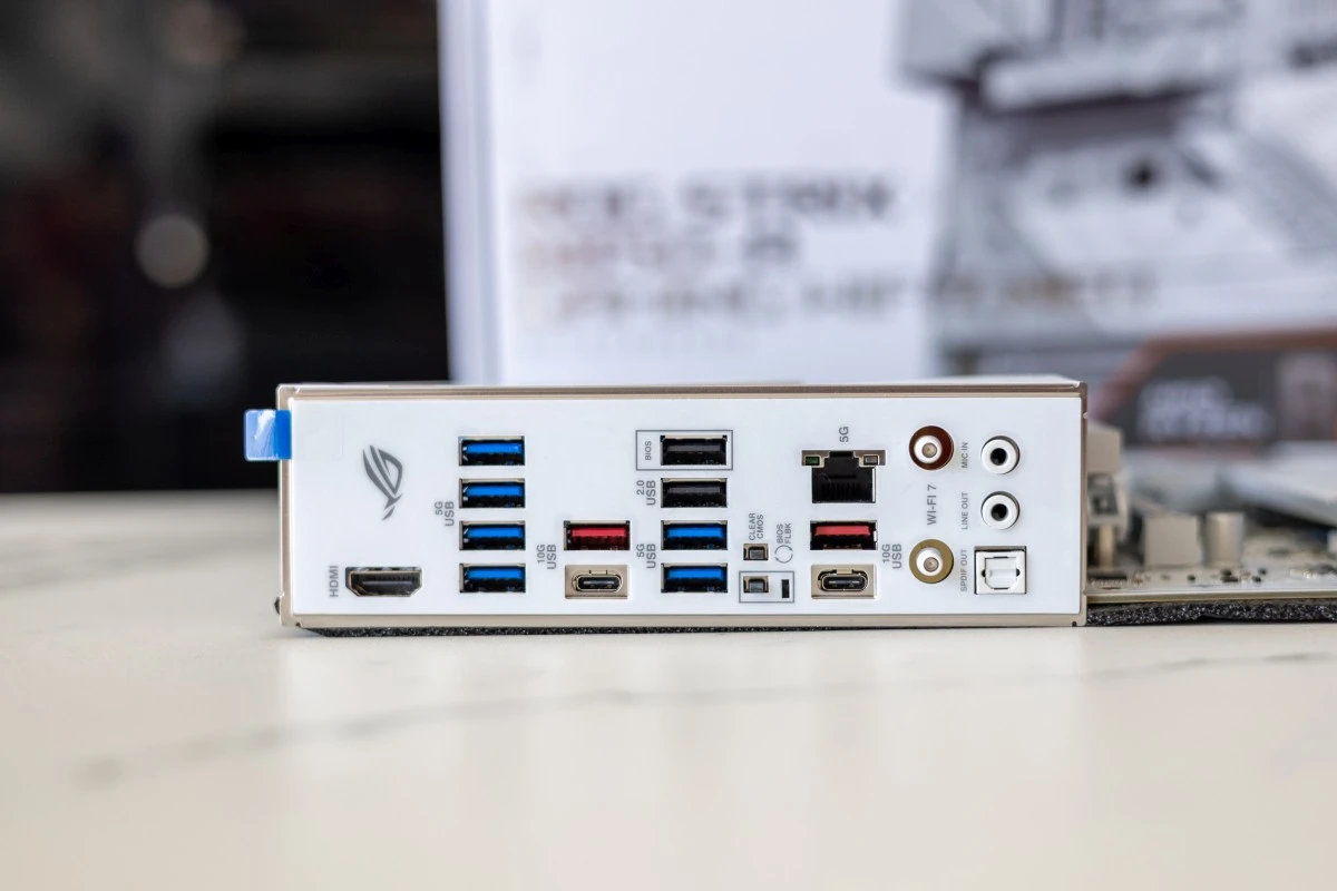 Sama ergonomia również została dobrze przemyślana. Pomagają sensownie rozmieszczone złącza wentylatorów, dobrze opisane porty i łagodnie wyprofilowane radiatory bez ostrych krawędzi. Na tylnym panelu mamy sporo złączy w tym dwa szybkie porty USB-C 20 Gb/s, dwa USB-A 10 Gb/s, cztery USB-A 5 Gb/s i dwa USB 2.0. Są też między innymi wyjścia graficzne HDMI i DisplayPort, antenowe Wi-Fi 7 i Ethernet 2,5G. Miły dodatek stanowią przyciski Clear CMOS i BIOS Flashback.