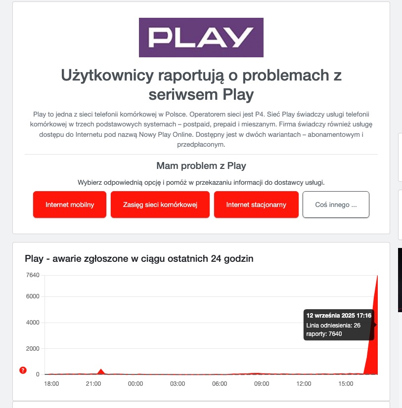 W serwisie Downdetctor dowiadujemy się, iż Play ma głównie problem z internetem mobilnym oraz zasięgiem sieci komórkowej. Strona internetowa ujawnia, iż problem jest w całej Polsce i największych miastach w kraju: Warszawie, Wrocławiu, Krakowie i innych miastach.