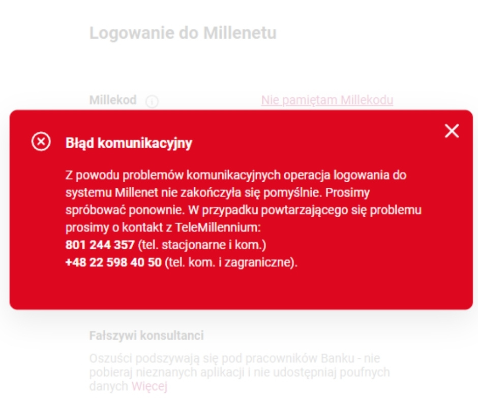 Przy próbie logowania w przeglądarce pojawia się komunikat Błąd komunikacyjny. Bank informuje w nim, iż operacja logowania nie zakończyła się pomyślnie z powodu problemów technicznych i prosi o ponowienie próby lub kontakt z infolinią TeleMillennium.
