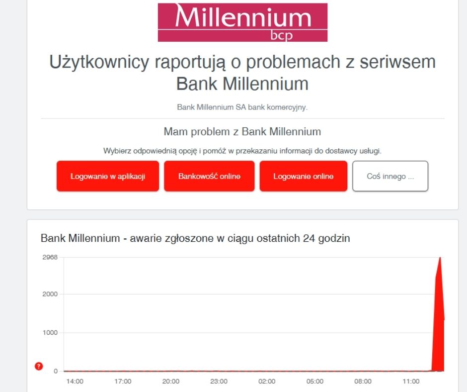 W serwisie DownDetector, który zbiera zgłoszenia użytkowników o awariach usług cyfrowych, widać gwałtowny skok liczby raportów dotyczących Banku Millennium. Problemy dotyczą przede wszystkim logowania online, bankowości internetowej oraz aplikacji mobilnej.