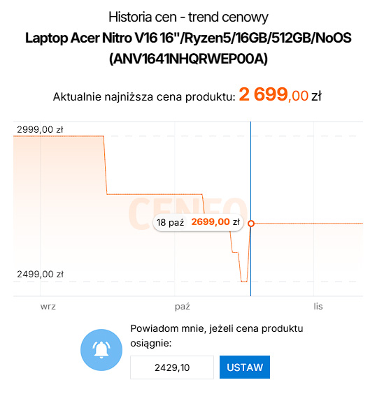 Wykres zmian cen laptopa Acer Nitro na Ceneo Wykorzystując dane o historii cen, a także możliwość ustawienia alertu o spadku cen, możesz dokonać zakupu w idealnym momencie i faktycznie zaoszczędzisz.