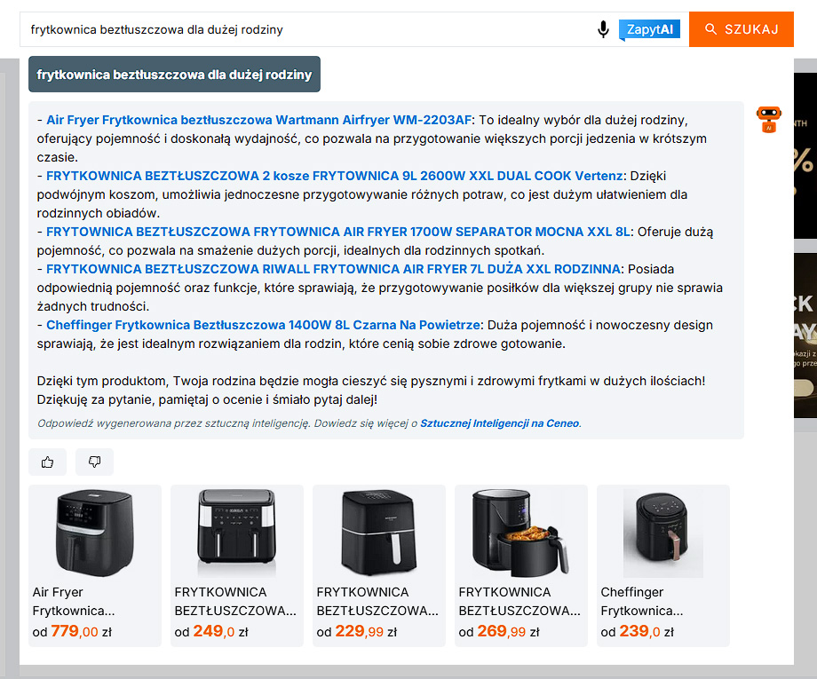 Możesz wpisać np. „frytkownica beztłuszczowa dla dużej rodziny”, a sztuczna inteligencja Ceneo w odpowiedzi podsunie kilka modeli, które – na podstawie recenzji oraz opisu własnego produktu – uzna za najbardziej odpowiadające twoim wymaganiom.