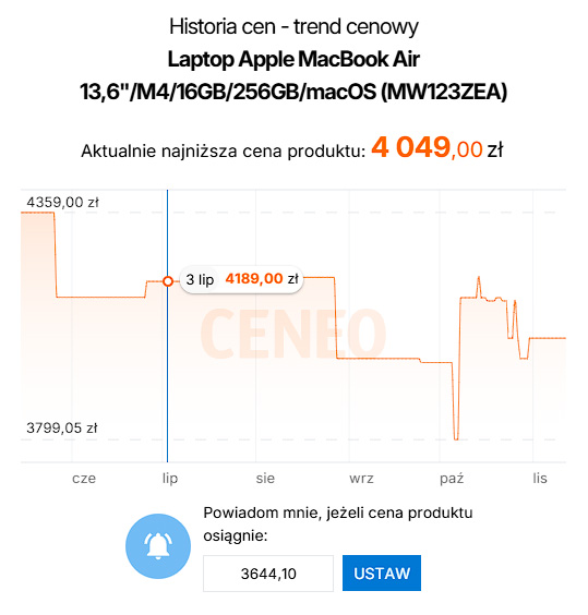 Jak to zrobić? Na Ceneo dostępna jest opcja Historia cen – trend cenowy, która pokazuje, ile dany produkt kosztował w ostatnich tygodniach i miesiącach. Dzięki temu od razu zobaczysz, czy obniżka jest rzeczywista. Przykład? Apple MacBook Air 13,6″M4 to model, którego cena w ostatnich miesiącach potrafiła się wahać – należy być ostrożnym widząc promocje.