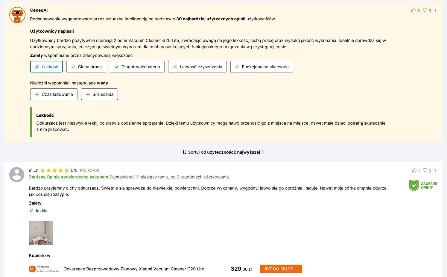 Przykład? jeżeli zastanawiasz się nad zakupem Xiaomi Vacuum Cleaner G20 Lite, nie musisz czytać setek komentarzy. Podsumowanie opinii pokaże Ci, iż użytkownicy chwalą go za cichą pracę, lekkość i czas pracy na jednym ładowaniu, ale wspominają, iż czas ładowania pozostawia trochę do życzenia.