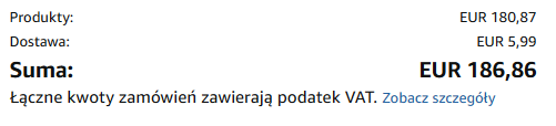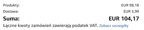 Przesyłka do Polski kosztuje 5,99 EUR, dlatego za całość zapłacimy 104,17 EUR, czyli około 440 zł. jeżeli wybierzemy płatność w złotówkach, zapłacimy 457 zł.