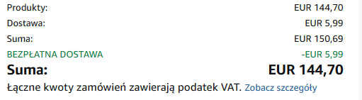 No i zaskoczenie – bo widzę dodatkową promocję na darmową dostawę, czyli nie płacimy tych 5,99 EUR, a dokładnie tyle ile jest na stronie produktu.