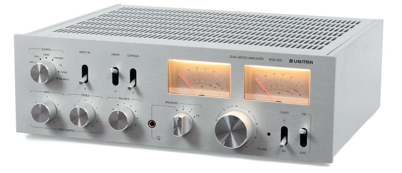 Tak, Unitra naprawdę wróciła — i to w wielkim stylu. WSH-805 to potężnie wykonany, nowoczesny wzmacniacz stereo, który odwołuje się do najlepszych tradycji polskiego audio, jednocześnie grając na poziomie wymagającym poważnego ucha. Aluminiowy front, charakterystyczne wskaźniki wychyłowe, solidna konstrukcja — tu wszystko krzyczy „klasyka w nowej erze”.