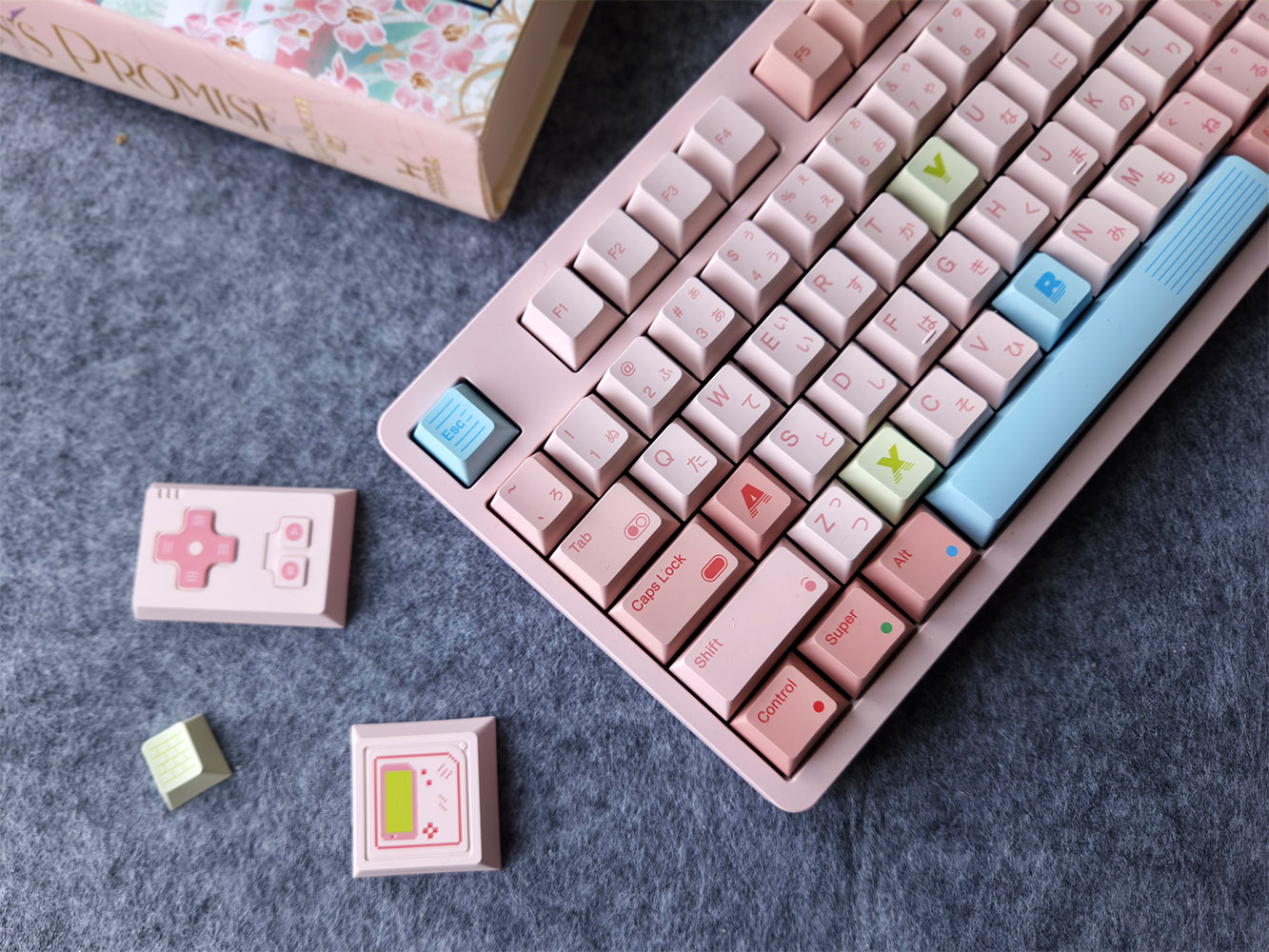 Tyle pracy, której efektem jest to cudeńkoKlawiatura wygląda fantastycznie, dokładnie tak jak sobie ją wyobrażałam – wyraźnie nawiązuje do konsol Nintendo, ale jest cukierkowa i tu ówdzie ma niestandardowe klawisze, których nie uświadczymy w sklepowo kupowanych klawiaturach. Choć zdecydowanie jestem osobą, która nie przykłada wagi do brzmienia klawiatury i od samego początku było mi obojętne jak będzie brzmiała finalna konstrukcja, to zakochałam się w mojej klawiaturze od pierwszego stuknięcia. Jej dźwięk jest bardzo gładki i równy, bez ostrych momentów ani nagłych trzasków, każdy klawisz brzmi podobnie i przewidywalnie. Gdybym używała nomenklatury TikToka, prawdopodobnie opisałabym moją klawiaturę jako „Creamy”.