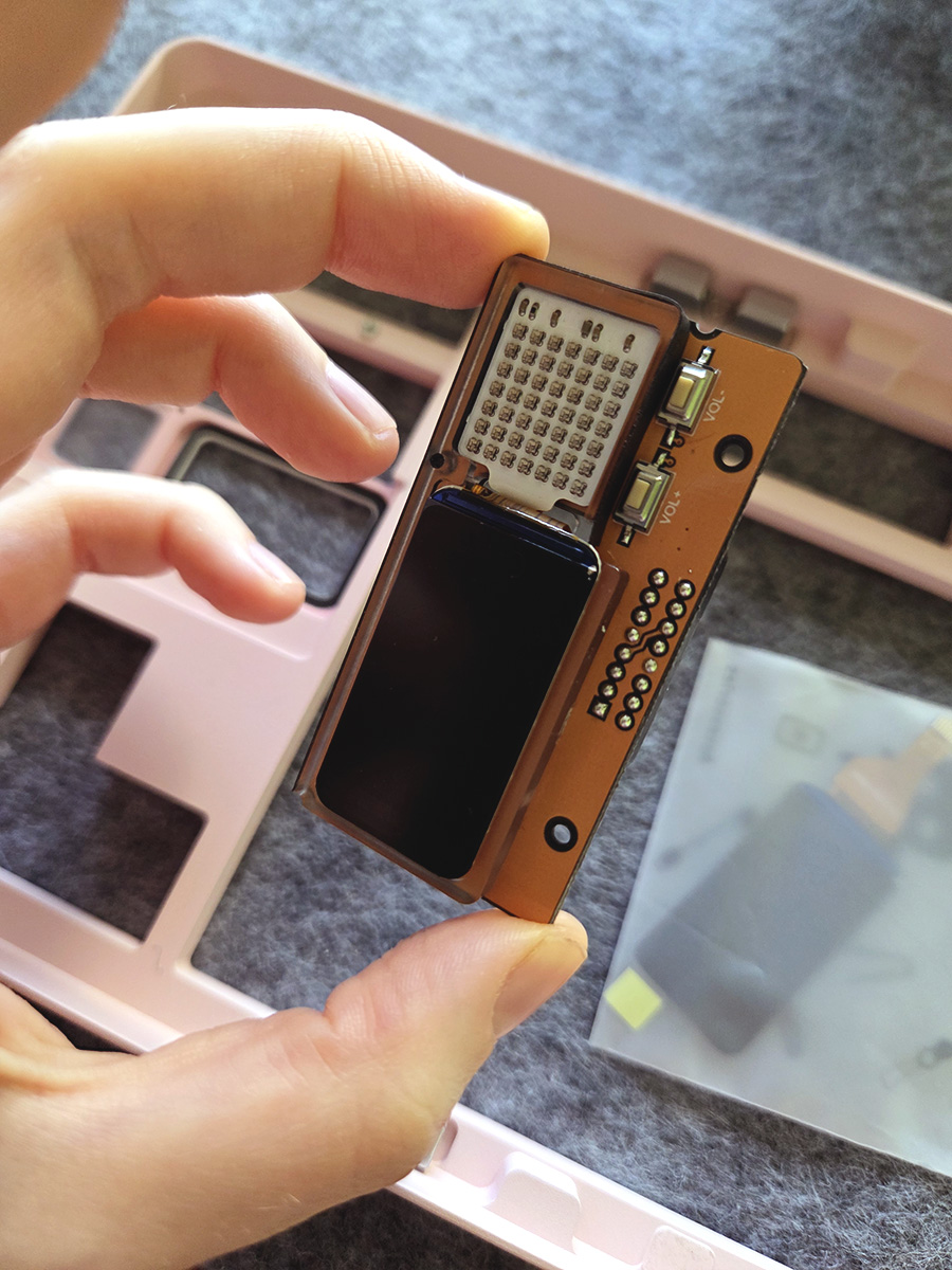 Pamiętacie ten mały ekranik, który skradł mi serce i przyczynił się do decyzji o zakupie akurat tego zestawu do budowania klawiatury? Po włożeniu wszystkich switchy, zgodnie z instrukcją Qwertykeys następuje moment nałożenia górnej pokrywy klawiatury. Ten moment stanowi też pierwszy moment gdy mogę zobaczyć działanie obu ekranów – z których LCD okazał się być fabrycznie uszkodzony.
