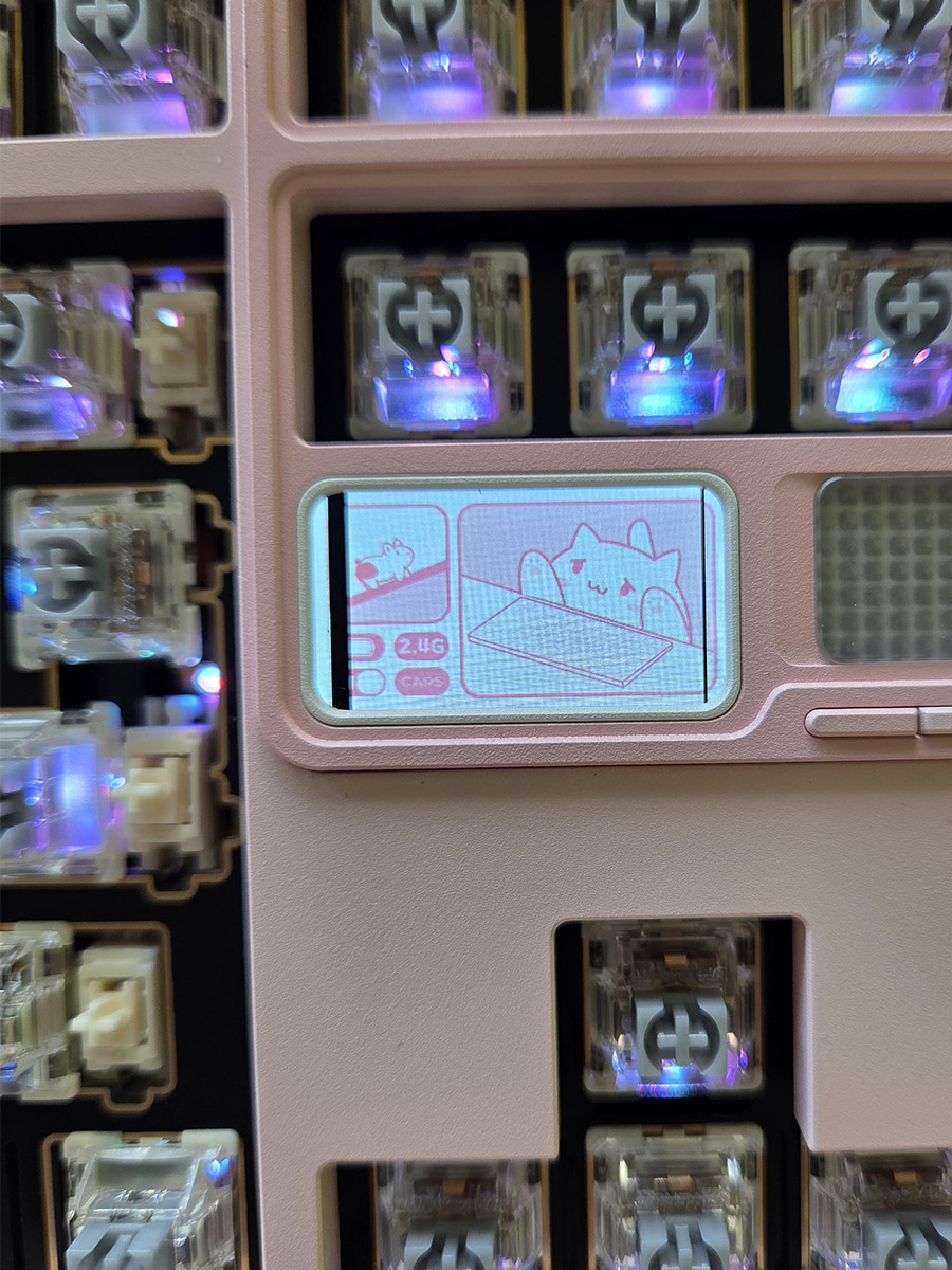W jego stronę popchnęło mnie nie tylko spełnianie moich wymagań, ale także deklarowana prostota złożenia – szalenie przyjazna nowicjuszom, oraz uroczy ekranik TFT LCD który adekwatnie nie służy do niczego poza wyświetlaniem godziny, uroczego kotka który stuka razem z tobą w klawiaturę lub samodzielnie załadowanej animacji.