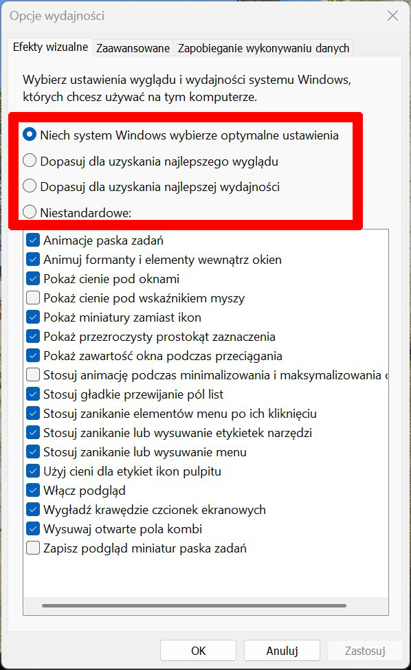 Microsoft w swoich zaleceniach sugeruje przejście na opcję Dopasuj dla uzyskania najlepszej wydajności w ustawieniach efektów wizualnych, co oznacza wyłączenie większości wizualnych usprawnień na rzecz wspomnianej wydajności.