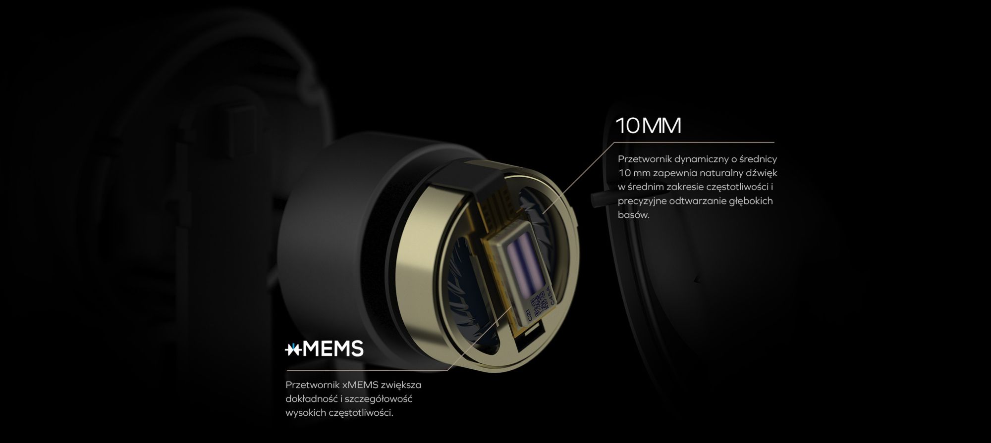 Wewnątrz każdej ze słuchawek, ważącej zaledwie 6 gramów , drzemie podwójny tor akustyczny. Za reprodukcję niskich i średnich częstotliwości odpowiada standardowy przetwornik dynamiczny o średnicy 10 mm. Z kolei za wysokie tony odpowiada zaawansowany przetwornik krzemowy xMEMS.
