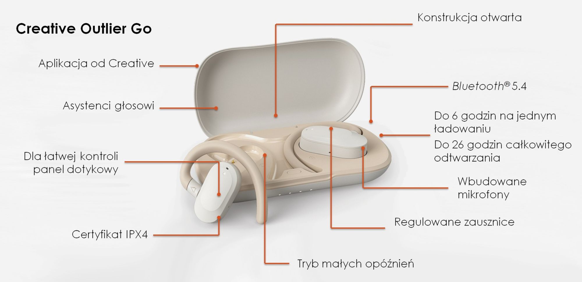Creative w modelu Outlier Go zastosował regulowane haczyki. Można je dostosować do kształtu małżowiny, co ma zapewnić stabilność choćby podczas biegania czy intensywnego treningu, a jednocześnie nie kolidować z okularami. Całość wykończona jest miękkim silikonem, co przy wadze piórkowej ma gwarantować komfort przez cały dzień.
