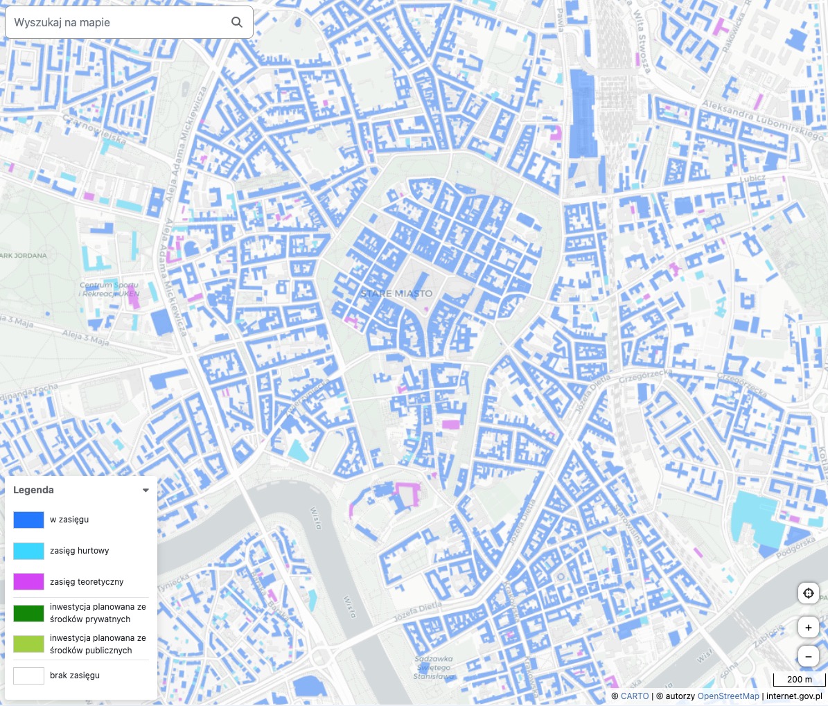 - po wyświetleniu mapy zobaczymy dostępność światłowodu w budynku;