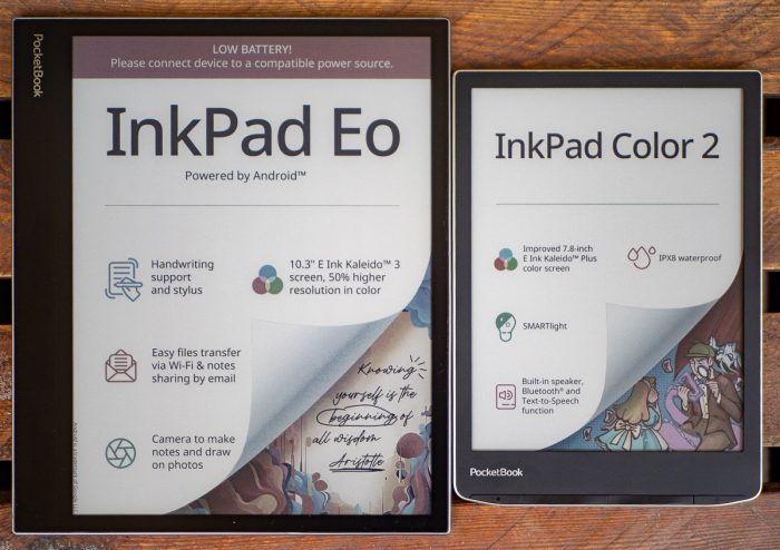 Na zdjęciu otwierającym artykuł umieściłem InkPad Eo i Color 2 – no i widzimy też efekt uboczny Androida. Po dwóch tygodniach leżenia na półce, w Eo wyczerpała się bateria, na jego mniejszym kuzynie wciąż działa. Urządzenie z Androidem trzeba po prostu ładować częściej. Wyobraźmy sobie, iż ktoś w ciągu tygodnia nie ma czasu w czytanie (bo praca), chce sięgnąć po czytnik w weekend, no i w przypadku „lepszego” czytnika z Androidem może go czekać niemiła niespodzianka.