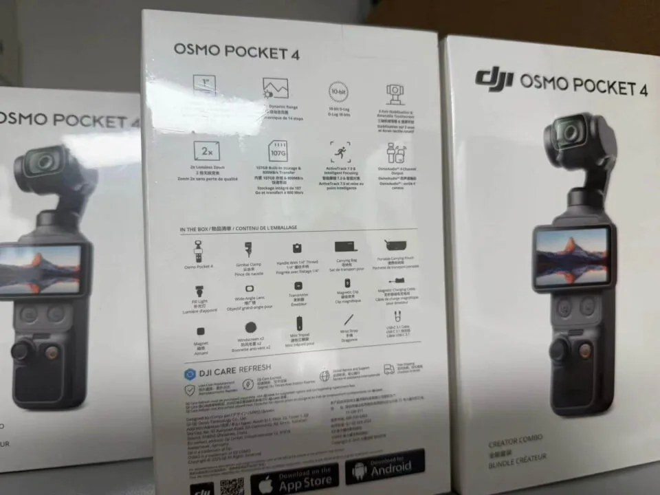 To oczywiście nie pierwszy raz, gdy na powierzchnię wypływają doniesienia na temat urządzenia. Jeszcze nigdy wcześniej jednak materiały nie prezentowały się aż tak oficjalnie. Poniżej możecie podejrzeć wysokiej jakości zdjęcia prezentujące opakowanie DJI Osmo Pocket 4 w kompleksowych wersjach, czyli Creator Combo i All-in-One Kit.