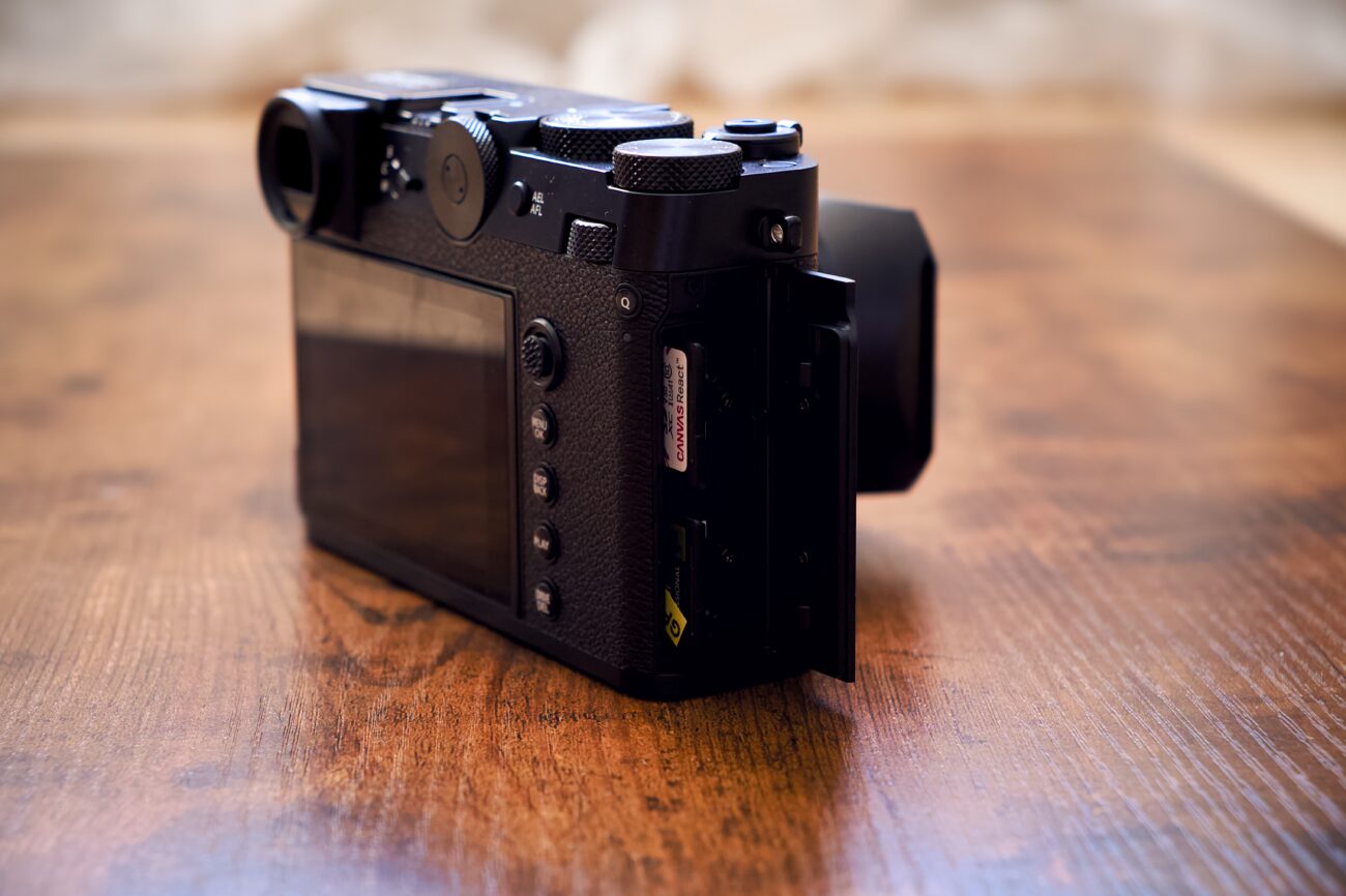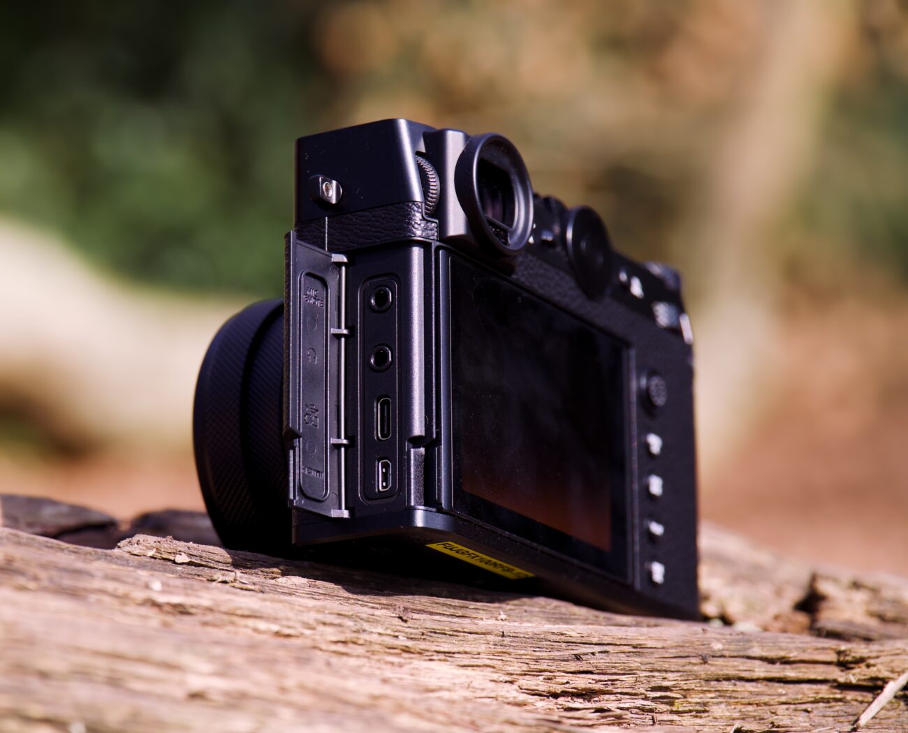 Fujifilm wyraźnie postawiło na kompaktowość konstrukcji, co widać chociażby po zestawie portów. Wszystkie umieszczono po lewej stronie korpusu – znajdziemy tu USB-C, micro HDMI oraz gniazda słuchawkowe i mikrofonowe. Zaślepka chroniąca złącza działa bardzo sprawnie i nie sprawia problemów podczas codziennego użytkowania.