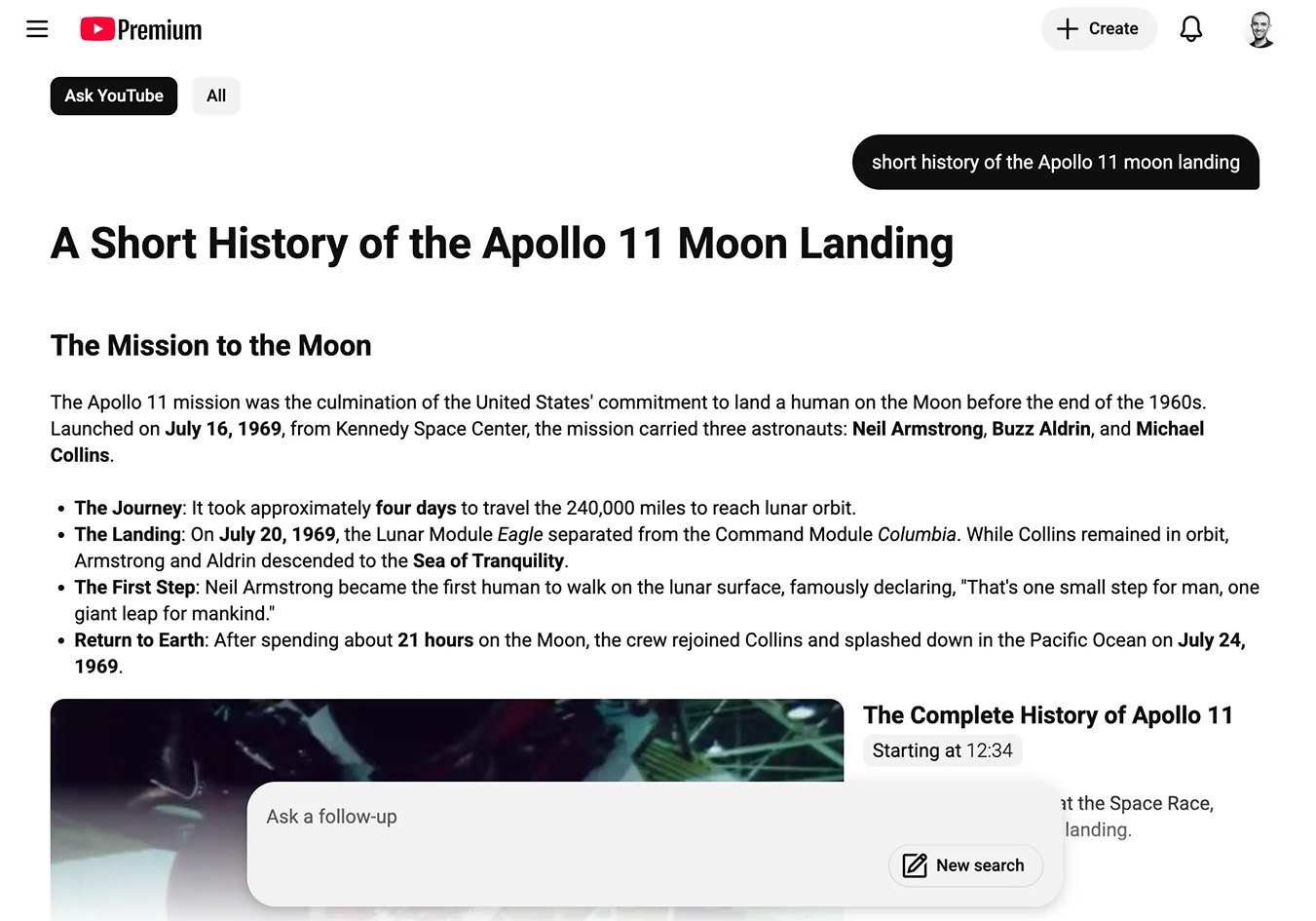 Działanie „Ask YouTube” na przykładzie zapytania o misję Apollo 11, źródło: The VergeInterfejs nie kończy się na jednej odpowiedzi. Na dole strony pojawiają się kolejne sugestie pytań, które pozwalają kontynuować eksplorację tematu i czatować zamiast oglądać wideo.