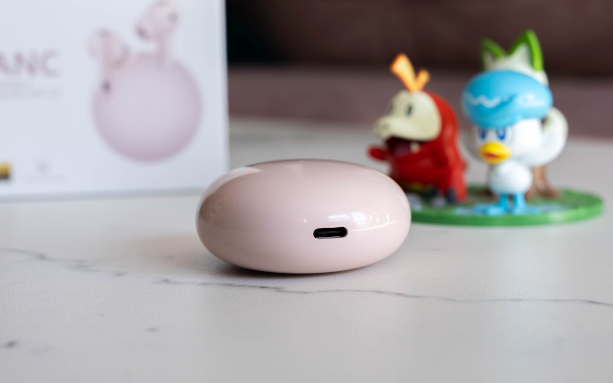Elementy wchodzące w skład etui to między innymi port USB-C, dioda stanu i przycisk do aktywacji trybu parowania. Doki na słuchawki klasycznie mają magnesy. Konstrukcja słuchawek jest chroniona przed dostępem pyłu i zachlapaniami, zgodnie ze standardem IP54. Etui podobnej normy natomiast nie spełnia.
