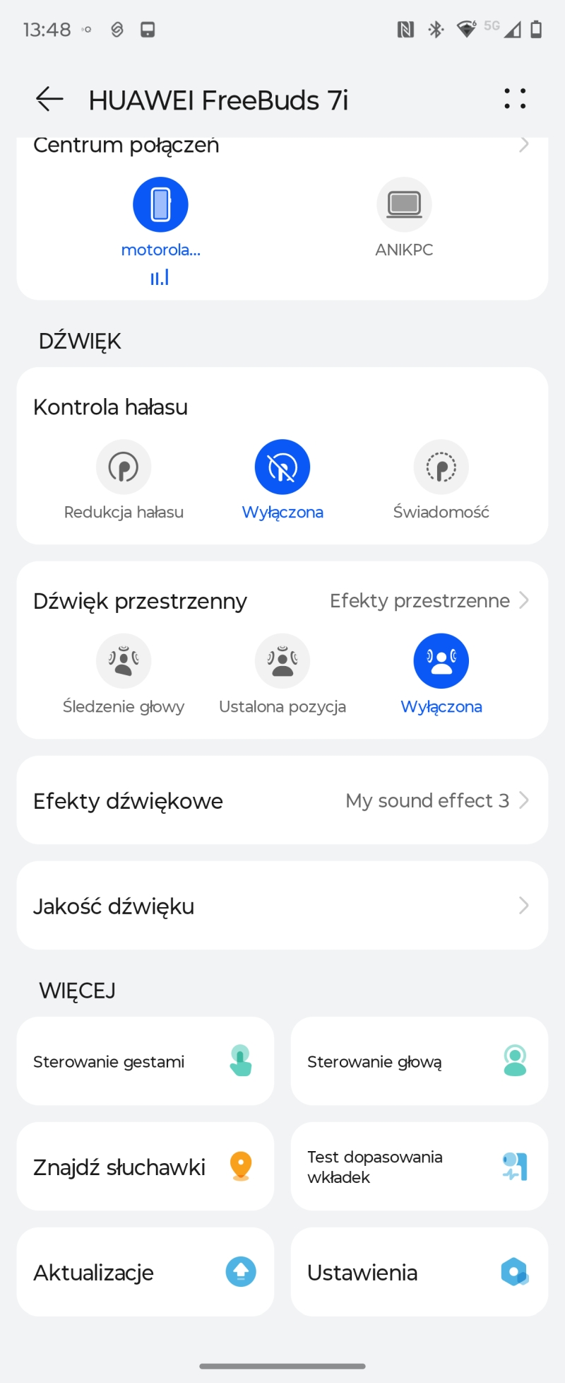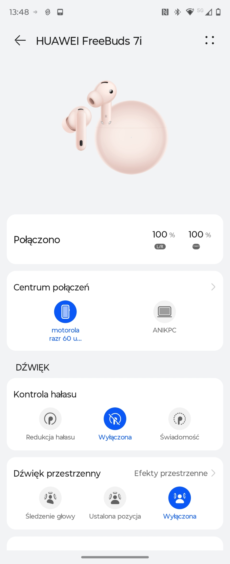Parowanie słuchawek ze telefonem można przeprowadzić zarówno bezpośrednio poprzez ustawienia Bluetooth, jak i w aplikacji. Cały ten proces szybki, zwłaszcza iż tryb parowania aktywuje się już przy pierwszym otworzeniu etui. FreeBuds 7i można sparować z kilkoma urządzeniami, ale połączenia multipoint działają tylko w parze ze sprzętem Huawei.