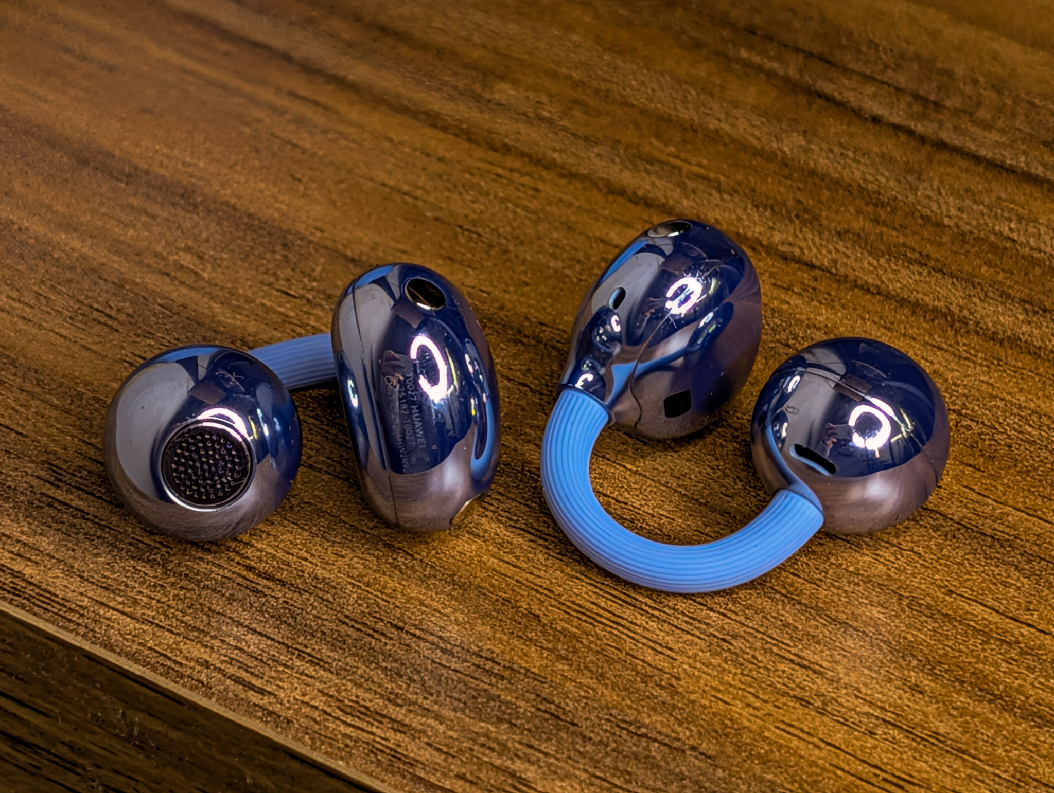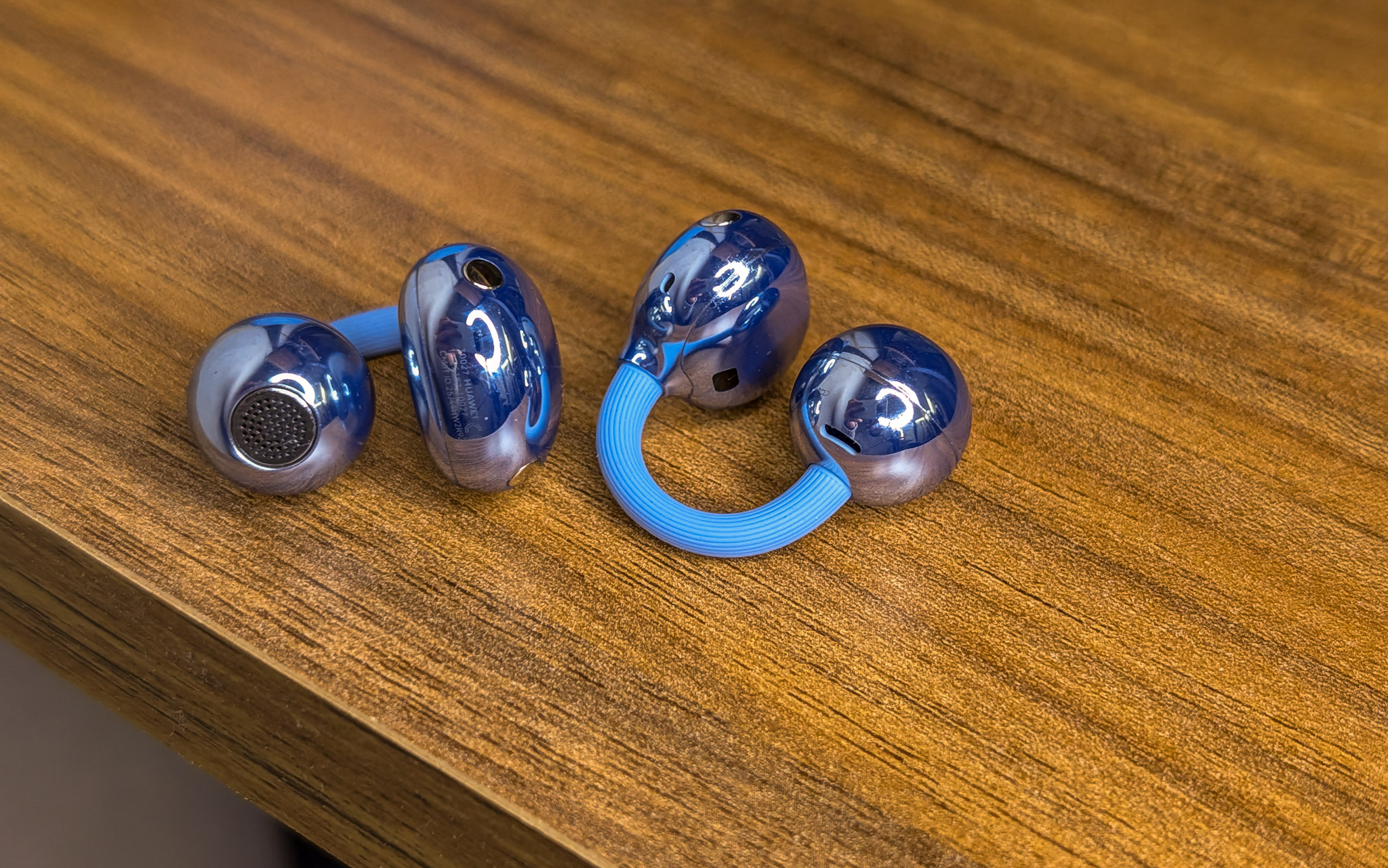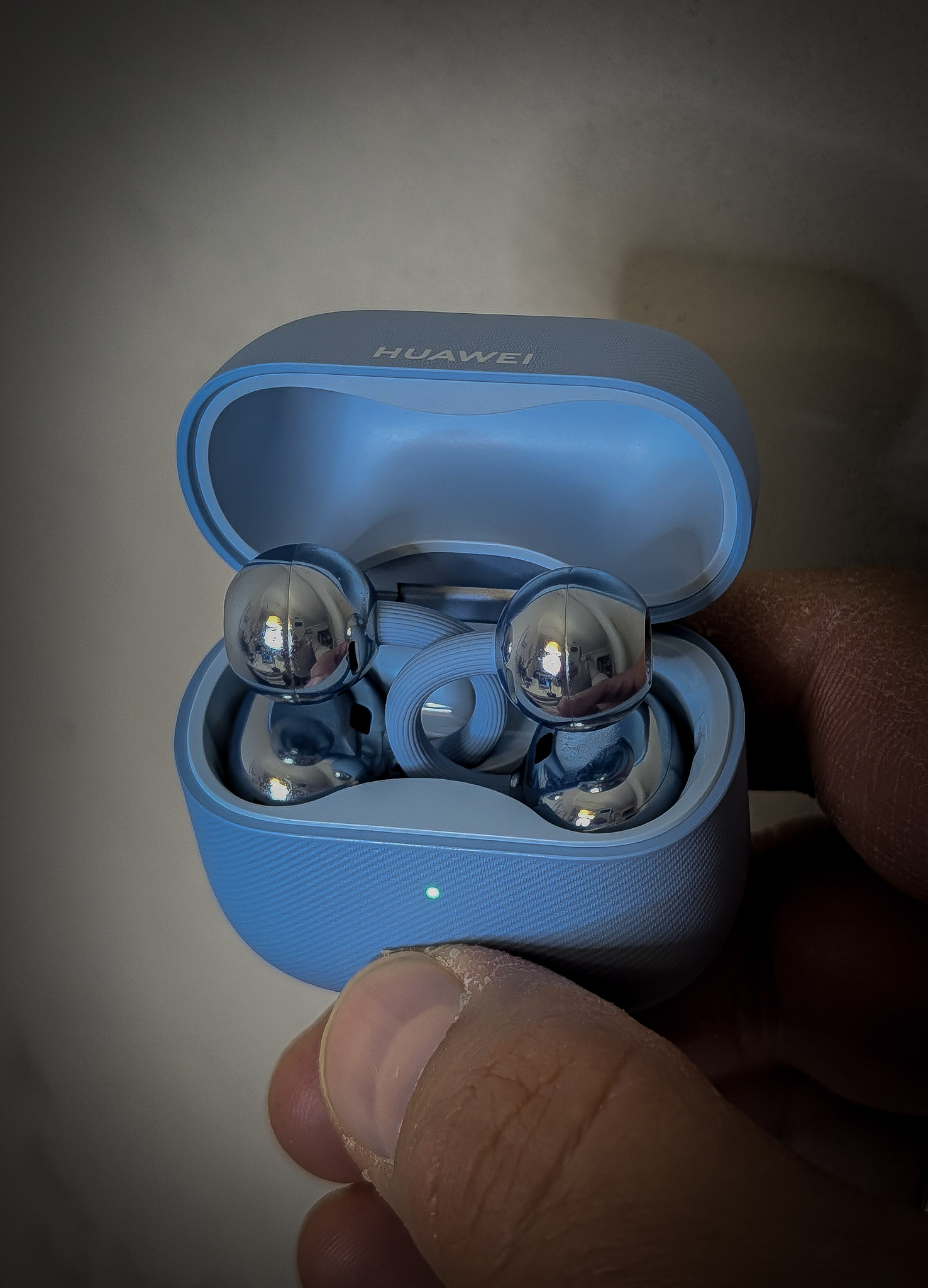 Nowe słuchawki ważą 5,1 g każda, co oznacza spadek o pół grama. Lekko zmodernizowano ich kształt, dzięki czemu lepiej trzymają się ucha, ale Huawei doszedł do wniosku, iż są tak lekkie, iż zaimplementował do nich system powiadomień o tym, iż wypadły. Nie zdarzyło mi się to podczas testowania, więc musiałem zrobić to specjalnie. Muzyka przestaje grać, gdy wypadną, więc będziemy wiedzieć, iż coś jest nie tak. Ponownie Huawei stworzył trzyczęściową konstrukcję – fasolkę z akumulatorem, kulkę z głośnikiem, a całość łączy elastyczny mostek. Jest wykonany z przyjaznego dla skóry materiału, który zapamiętuje kształt ucha. Huawei twierdzi, iż ma teksturę dżinsu, ale nie będę na ten temat się kłócił. Jest po prostu inaczej niż dwa lata temu i lepiej. Słuchawki występują w kolorze czarnym, białym, niebieskim (mam takie) oraz różowego złota. Te ostatnie to już naprawdę kolczyki, ale o tym później.