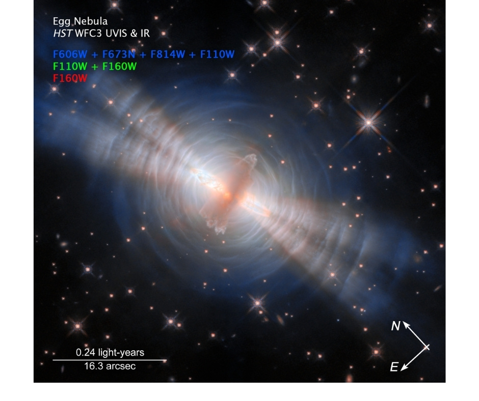 Gwiazda w centrum Mgławicy Jajko jest otoczona grubą warstwą pyłu, która skutecznie blokuje większość światła. W niektórych miejscach powłoka jest jednak cieńsza, pęknięta lub wyrzeźbiona przez potężne strumienie gazu. To przez te szczeliny wydostają się promienie, które widzimy jako jasne, symetryczne stożki.