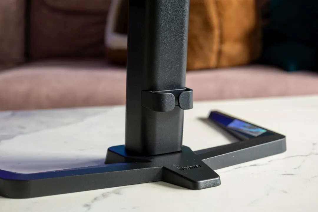 Na pochwałę zasługuje dwuramienna podstawa. Nie zajmuje dużo miejsca na biurku, jest bardzo stabilna i pozwala na szeroki zakres regulacji monitora. iiyama G-Master GB3290QSU możemy regulować na wysokość w zakresie aż 150 mm, do tyłu i przodu (odpowiednio 23 stopnie i 5 stopni), a także o 45 stopni na boki. Piwot pozwala korzystać z płaskiego ekranu obróconego pod kątem 90 stopni w pionie. Alternatywnie można skorzystać z mocowania VESA w standardzie 100×100 i powiesić monitor na ramieniu lub uchwycie na ścianę.