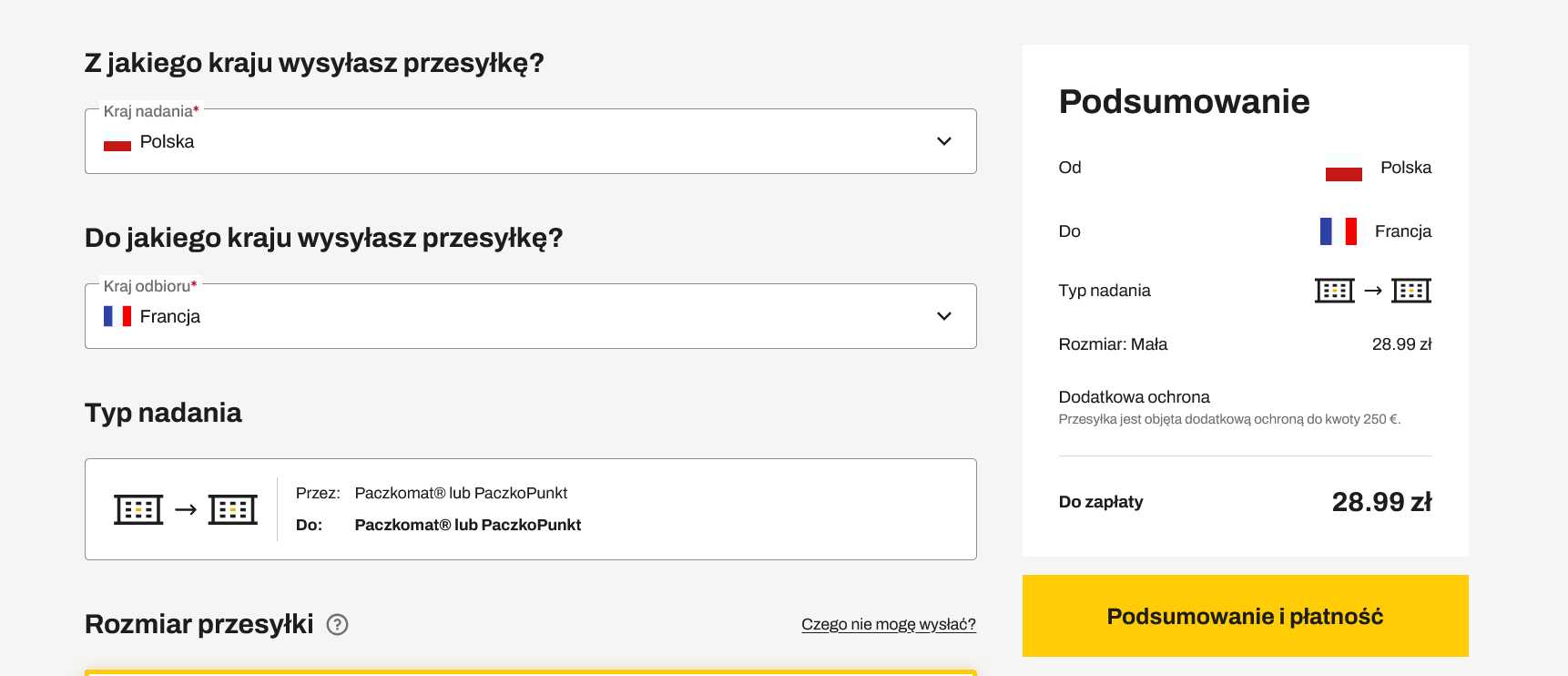 Za pomocą strony InPost Easy wysłać można trzy rodzaje przesyłki: małą (8x38x64 cm), średnią (19x38x64 cm) i dużą (39x38x64 cm). Przykładowy koszt wysyłki z Polski do Francji to odpowiednio 28,99 zł, 49,99 zł i 54,99 zł.