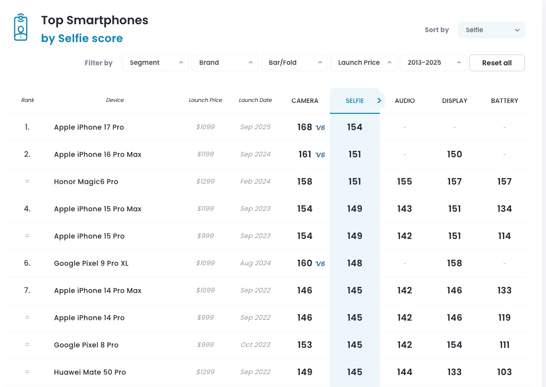 Natomiast nowym liderem w rankingu jest iPhone 17 Pro, który w teście selfie DXOMark zebrał aż 154 punkty, które łączą wynik możliwości zdjęć oraz nagrywania wideo przednią kamerką. Twórcy rankingu podkreślają, iż najlepszy iPhone może pochwalić się precyzyjną ekspozycją, szerokim zakresem dynamiki, dobrym odwzorowaniem kolorów, wzorowym autofocusem oraz głębią ostrości na zdjęciach i filmach.