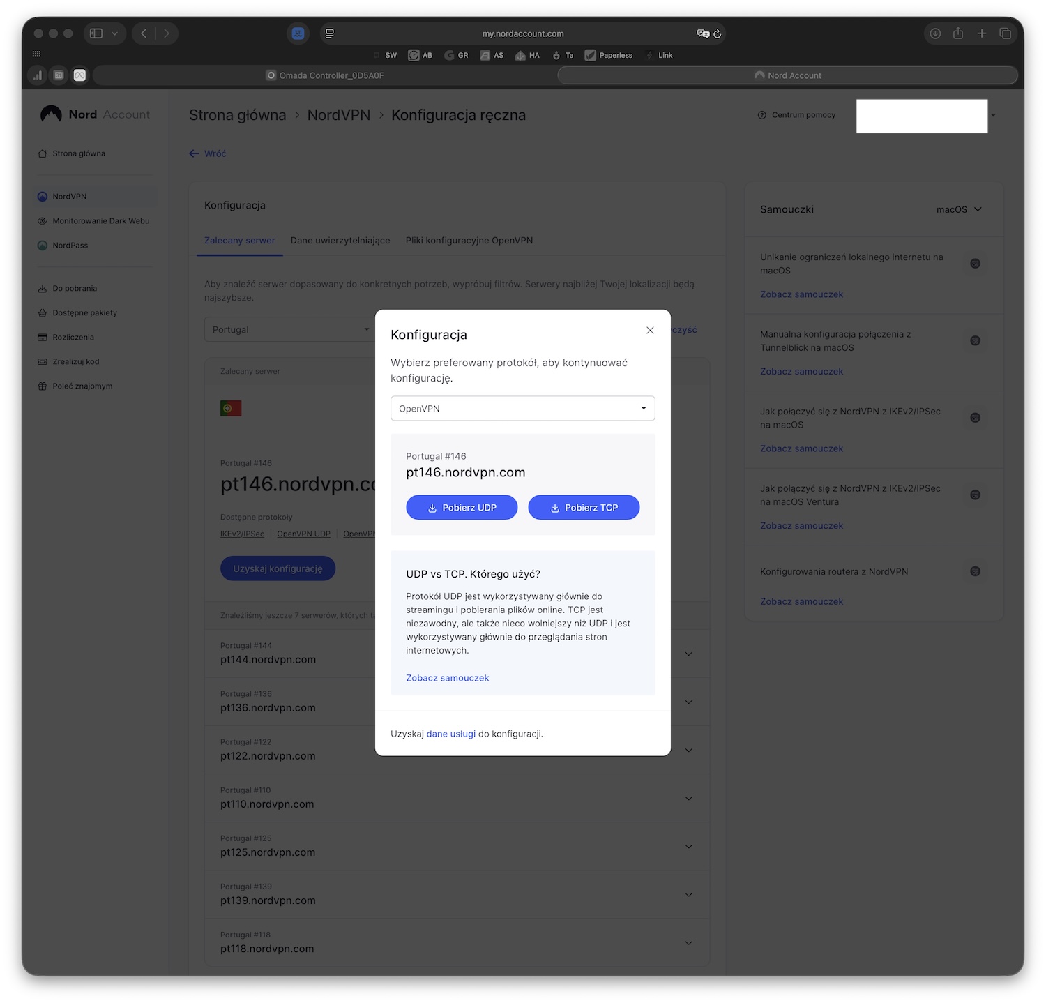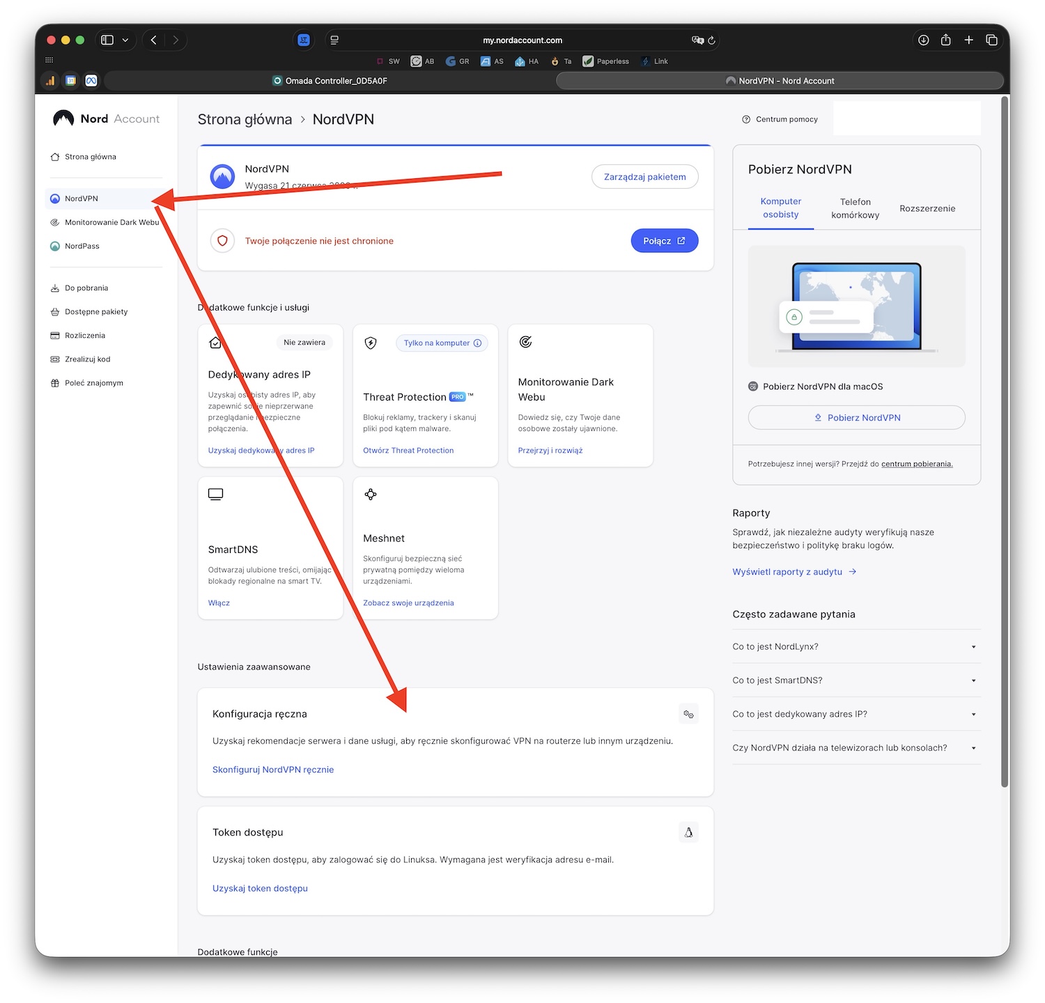 W tym momencie zostawiamy na chwilę Omadę i logujemy się do naszego konta NordVPN. Z lewego panelu wybieramy „NordVPN” i „Konfiguracja ręczna”. Klikamy w „Skonfiguruj NordVPN manualnie” i przechodzimy dalej.