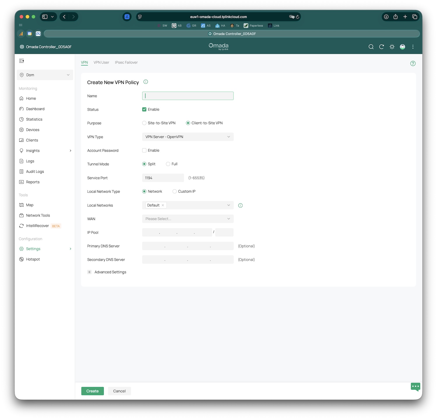 Po czym w pozycji Purpose wybieramy „Client-to-Site VPN”, w Mode – „Certificate+Account”, natomiast w VPN Type: „VPN Client” i „OpenVPN”. Oczywiście w międzyczasie musimy wybrać nazwę dla naszego połączenia: