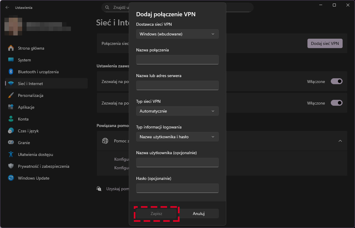 - W polu Dostawca sieci VPN wybierz Windows (wbudowane).