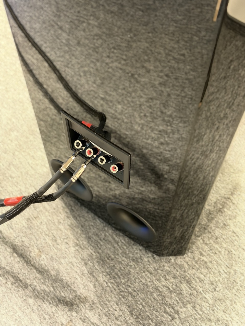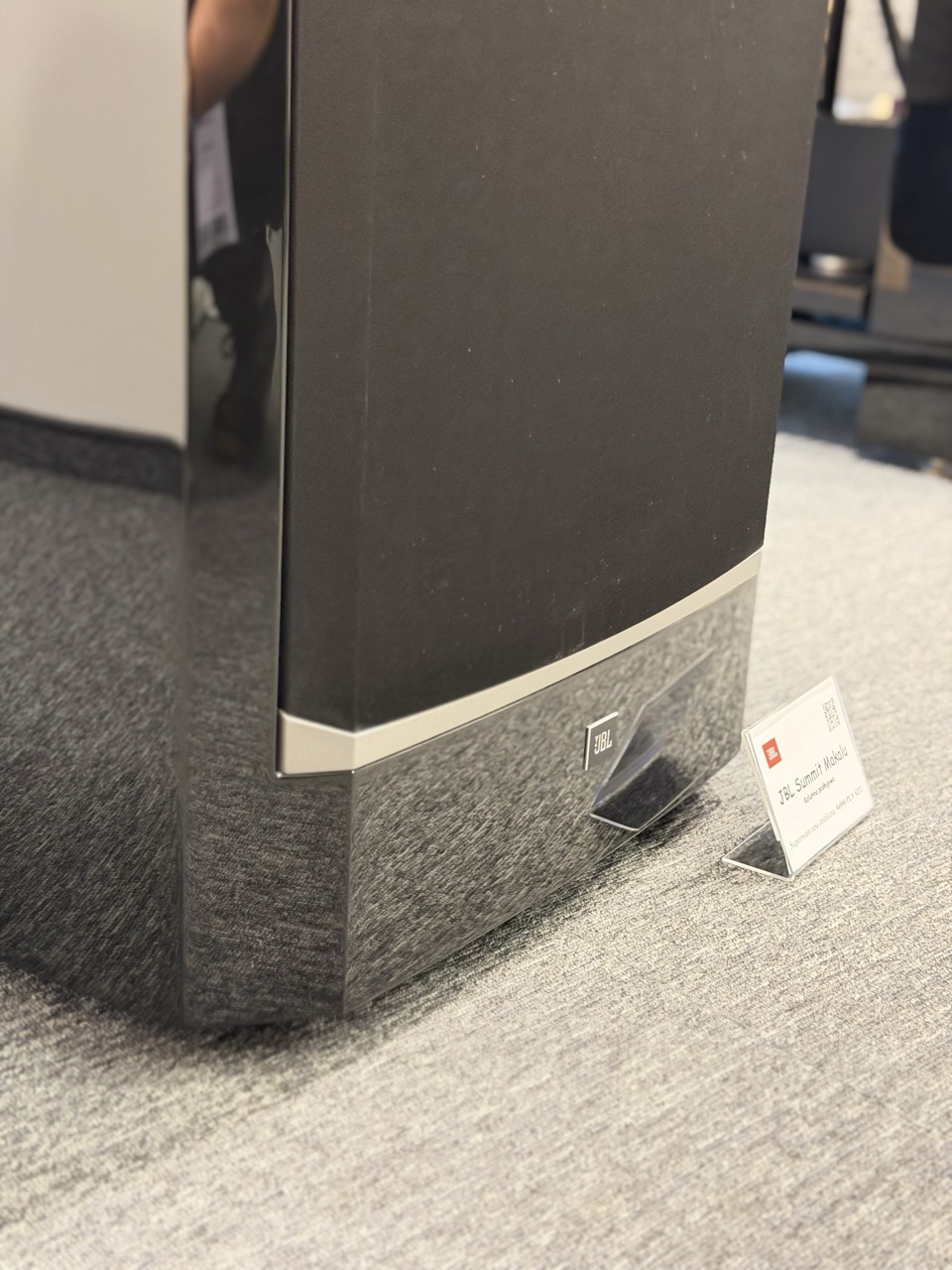 Kolumny z linii JBL Summit Makalu można było oczywiście obejrzeć z każdej strony, a charakteryzują się one naprawdę eleganckim wzornictwem. Wykończone są na czarny połysk, a jak podejdziemy do nich bliżej, to odbijają otoczenie niczym lustro. Z tyłu znalazła się z kolei kratka, w środku której umieszczono wszystkie niezbędne złącza, aby podpiąć je do sprzętu grającego.