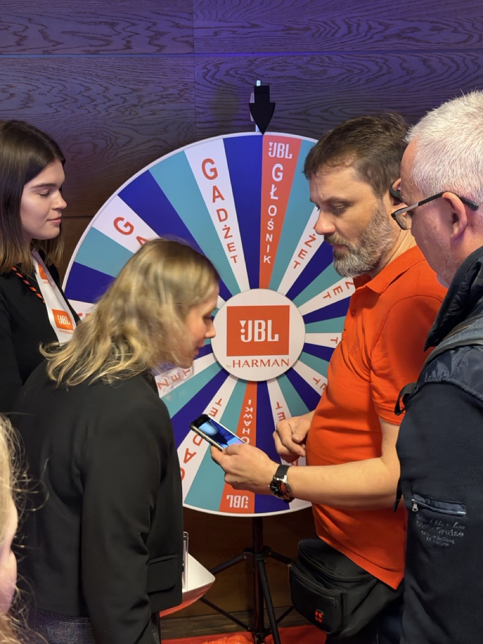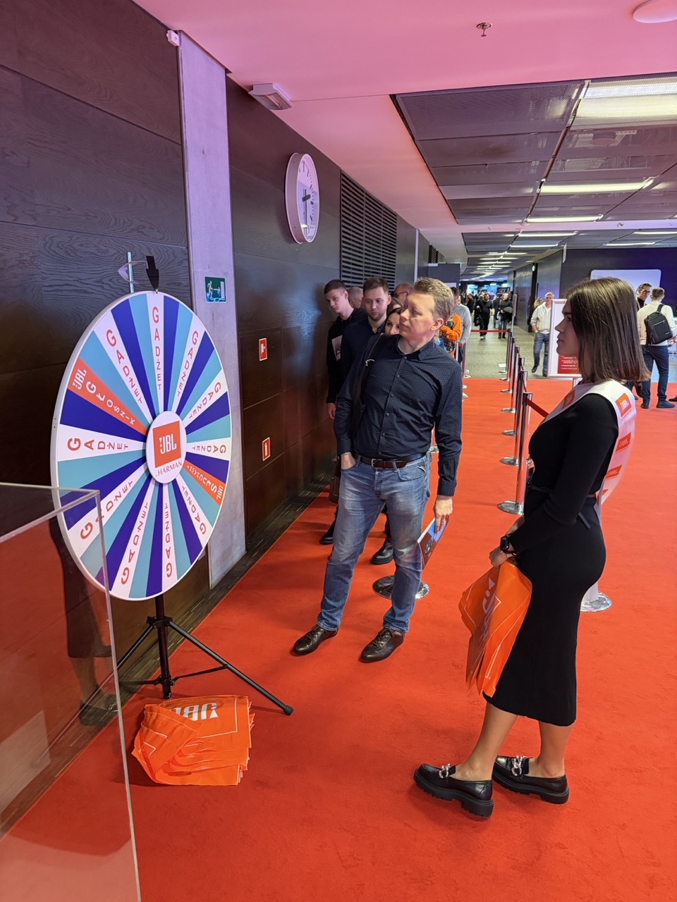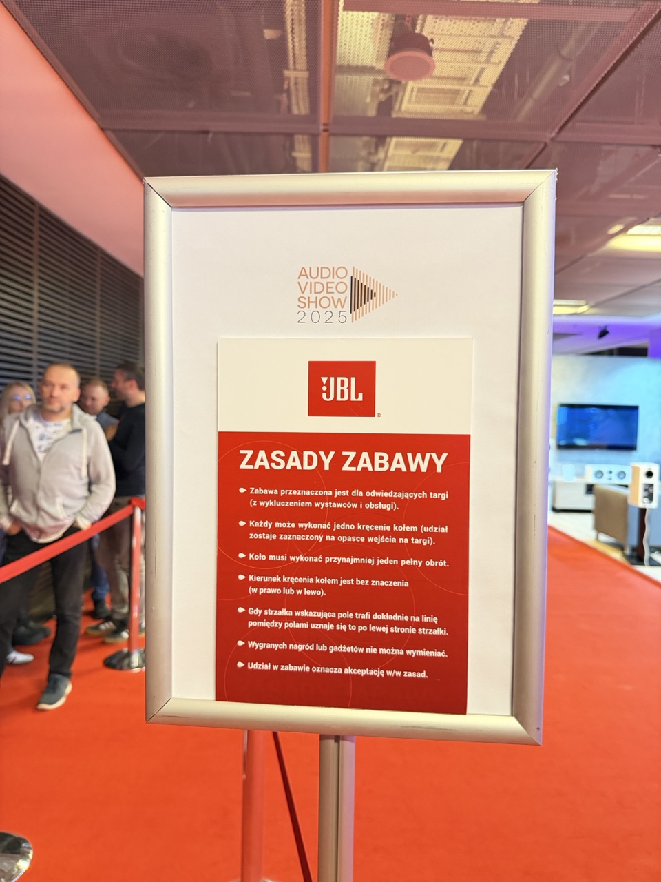 Oprócz tego marka JBL była, jak co roku, obecna w przestrzeni pomiędzy salami, w których swoje sprzęty prezentowali podczas Audio Video Show 2025 liczni inni producenci. Goście mogli zakręcić kołem fortuny, co dawało im szansę na zdobycie gadżetów lub, jeżeli im się poszczęściło, głośników tej marki.