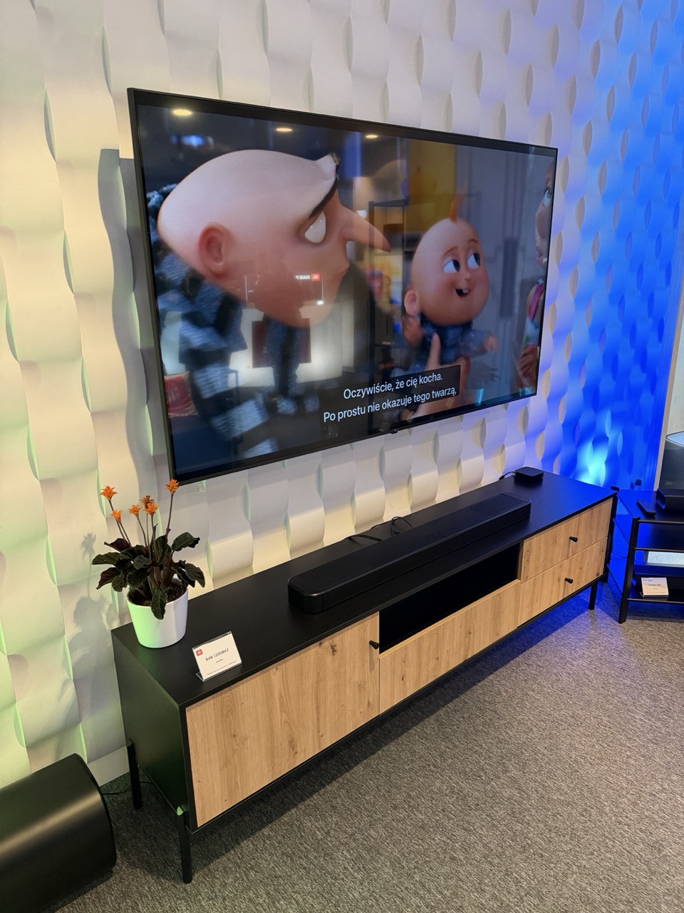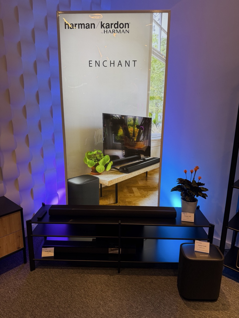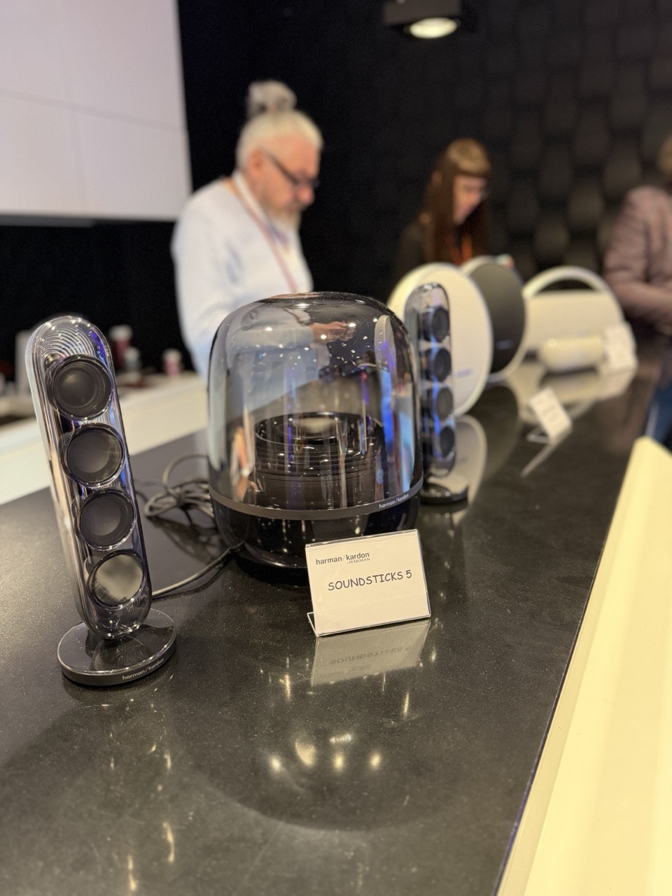Na stoisku JBL podczas Audio Video Show 2025 pojawiły się również sprzęty obrandowane marką harman/kardon z serii Enchant, w tym soundbary, subwoofery i głośniki. Najciekawszym z nich był zestaw Soundsticks 5 z przezroczystą obudową.