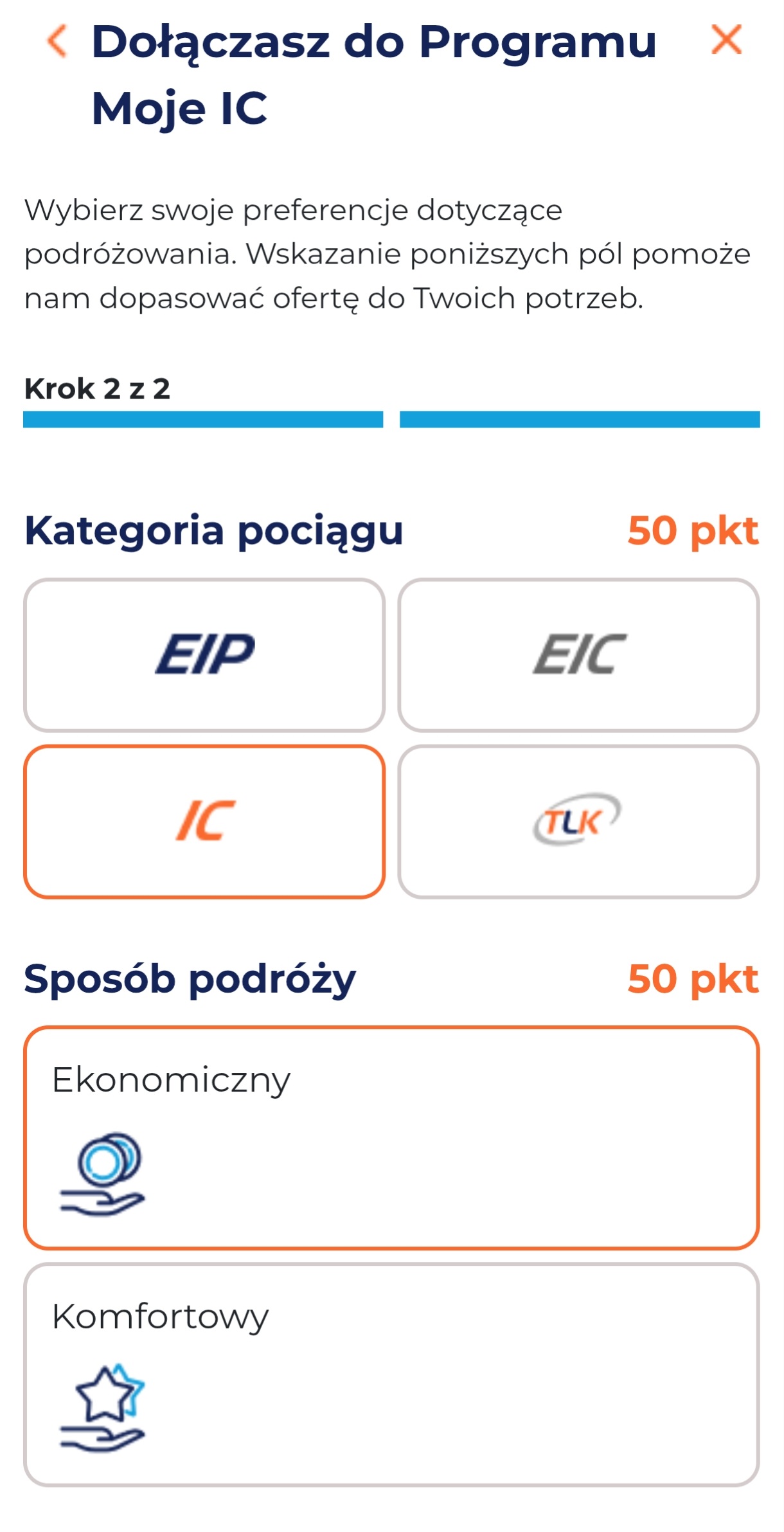 Następnie możemy podzielić się z przewoźnikiem preferencjami dotyczącymi podróżowania. Wszystkie opcjonalne dane PKP Intercity wycenienia łącznie na kolejne 250 punktów. Nie są to specjalne poufne informacje. Wskazujemy najczęściej wybieraną kategorię pociągu, sposób podróży (ekonomiczny bądź komfortowy), główny cel wypraw (prywatne lub biznesowe) oraz formę – czy w pojedynkę, ze znajomymi czy z rodziną w większej grupie.