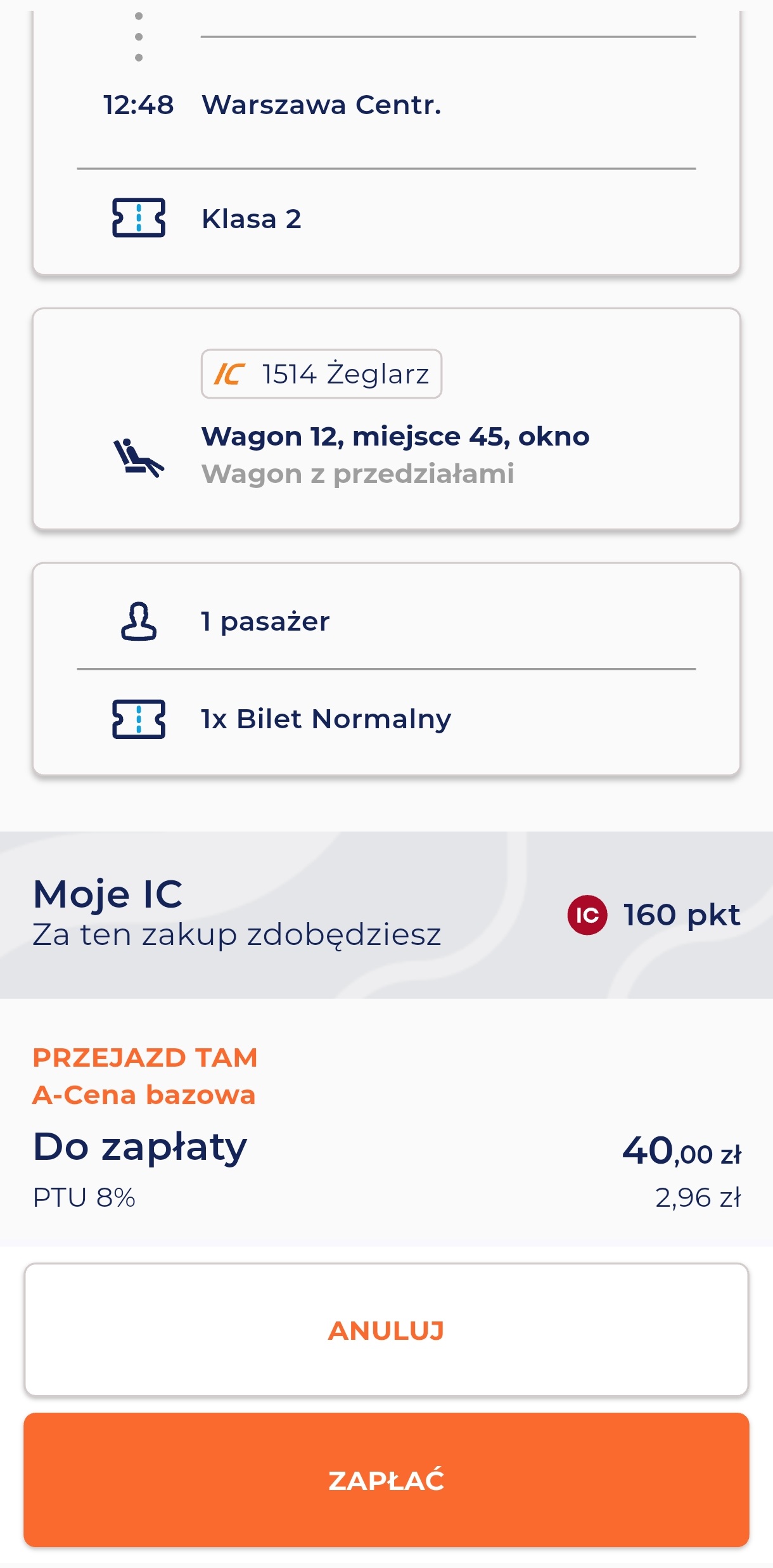 250 za start i łącznie 250 za informacje. Czy to dużo? Za każdą złotówkę wydaną na bilet wpadają 4 punkty. I tak np. wyprawa z Łodzi do Warszawy, wyceniona na 40 zł za bilet w drugiej klasie, przekłada się na 160 punktów. Miło, iż przewoźnik wyręcza takie osoby jak ja, które unikają liczenia, i już przy zakupie wejściówki na pokład pokazuje, ile punktów się zdobędzie.