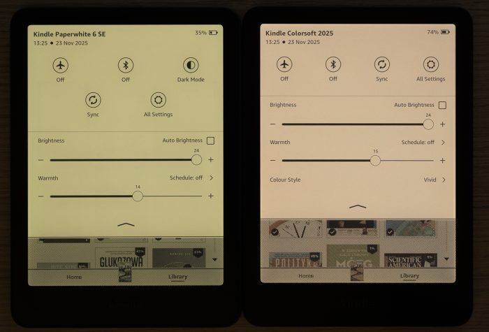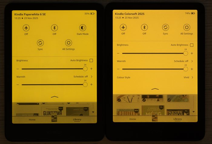 Jeśli porównujemy ekrany w ciemności, widać, iż Paperwhite jest żółtawy, Colorsoft bardziej czerwonawy. Ale jak pokażę dalej przy książkach o fotografii, maksymalne oświetlenie w ciemności, to nie jest naturalna sytuacja, gdy korzystamy z czytnika. Gdy jest ciemno, ustawiam maksymalnie 10/24, a zwykle mniej, wtedy różnice są znacznie mniej zauważalne.