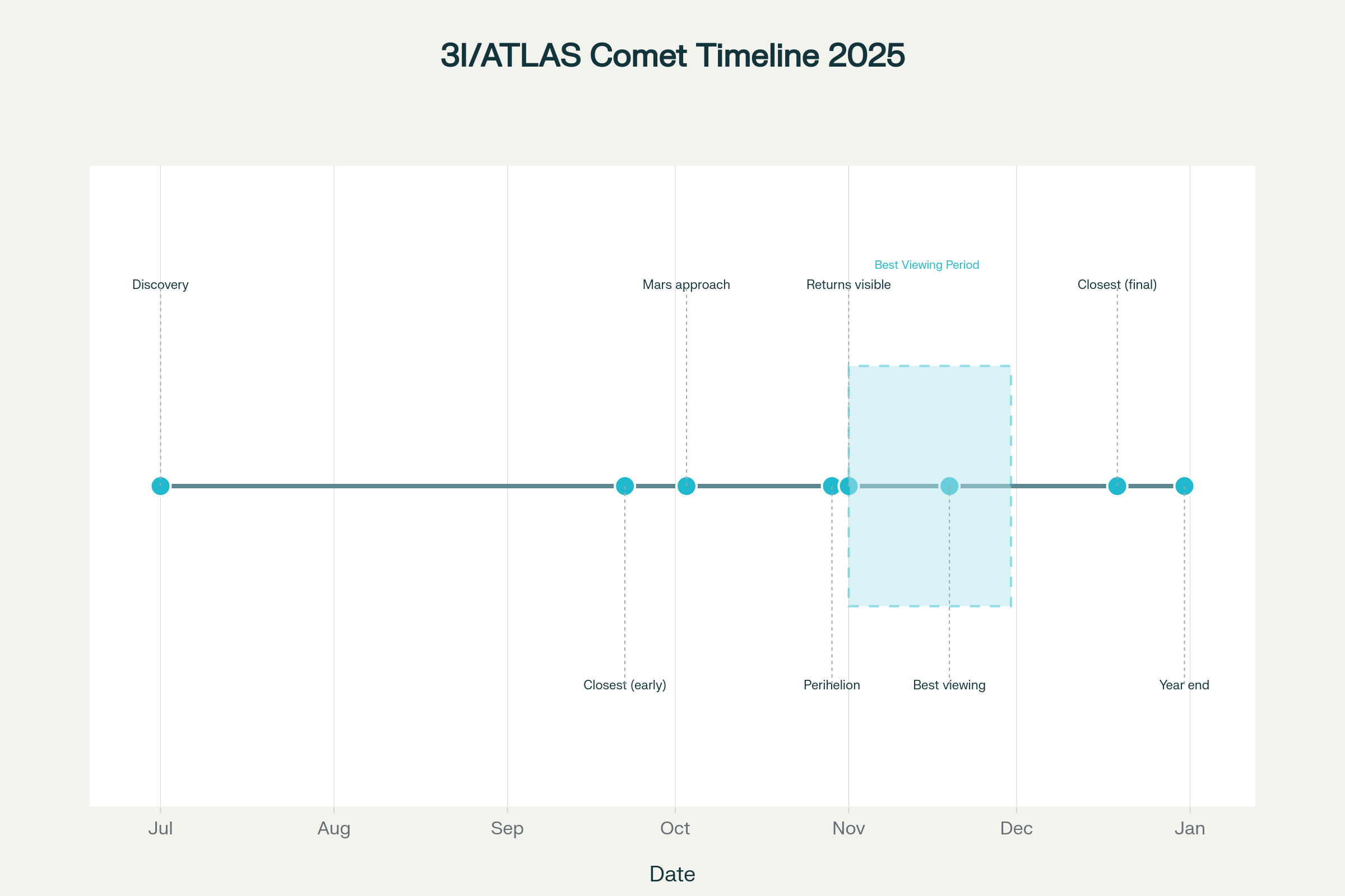 Kluczowe daty obserwacji komety 3I/ATLASDla obserwatorów z północnej półkuli najdogodniejszy czas na obserwacje przypada w listopadzie i grudniu. Kometa osiągnęła peryhelium – czyli punkt największego zbliżenia do Słońca – 29 października, w odległości 203 mln km. To właśnie wtedy jej aktywność i jasność znacząco wzrosły.