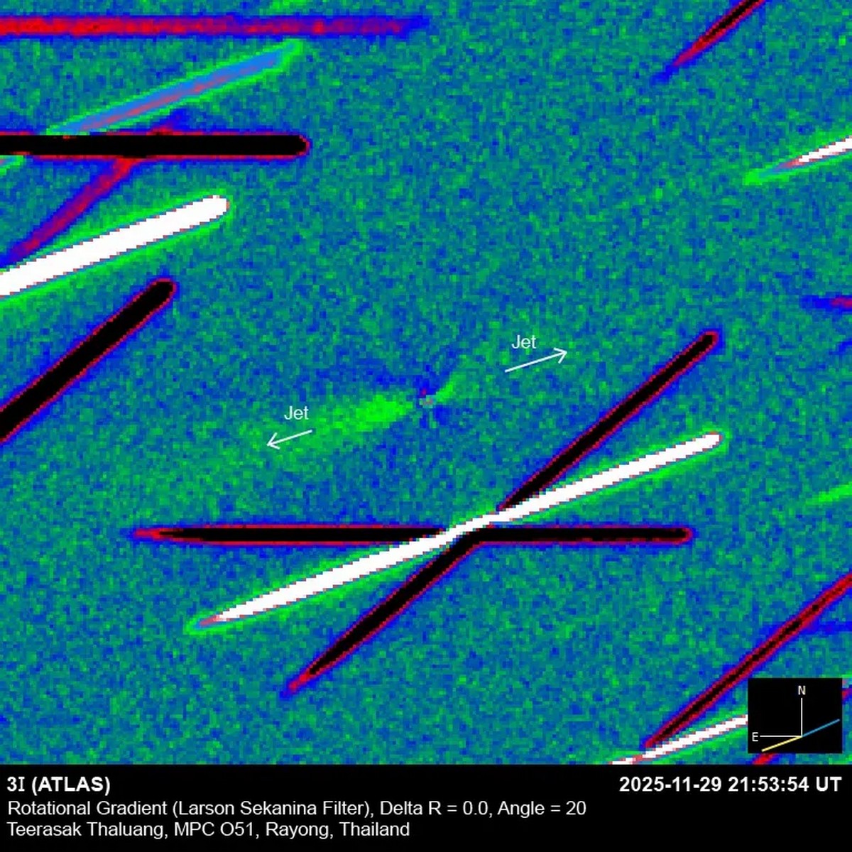 Listopadowe zdjęcie z Tajlandii jest w zasadzie wizualnym potwierdzeniem hipotez Loeba. Dżety komety 3I/Atlas nie są chaotyczne, wyglądają na periodyczne. Ich symetria jest wręcz nienaturalna, a kąty wyrzutu opierają się wpływowi Słońca. Gdyby były to naturalne gejzery gazowe, chwiałyby się, migotały i zniekształcały wraz z obrotem jądra. Tutaj, choćby po pełnej analizie gradientowej, prezentują się jako zdyscyplinowane, regularne wiązki.