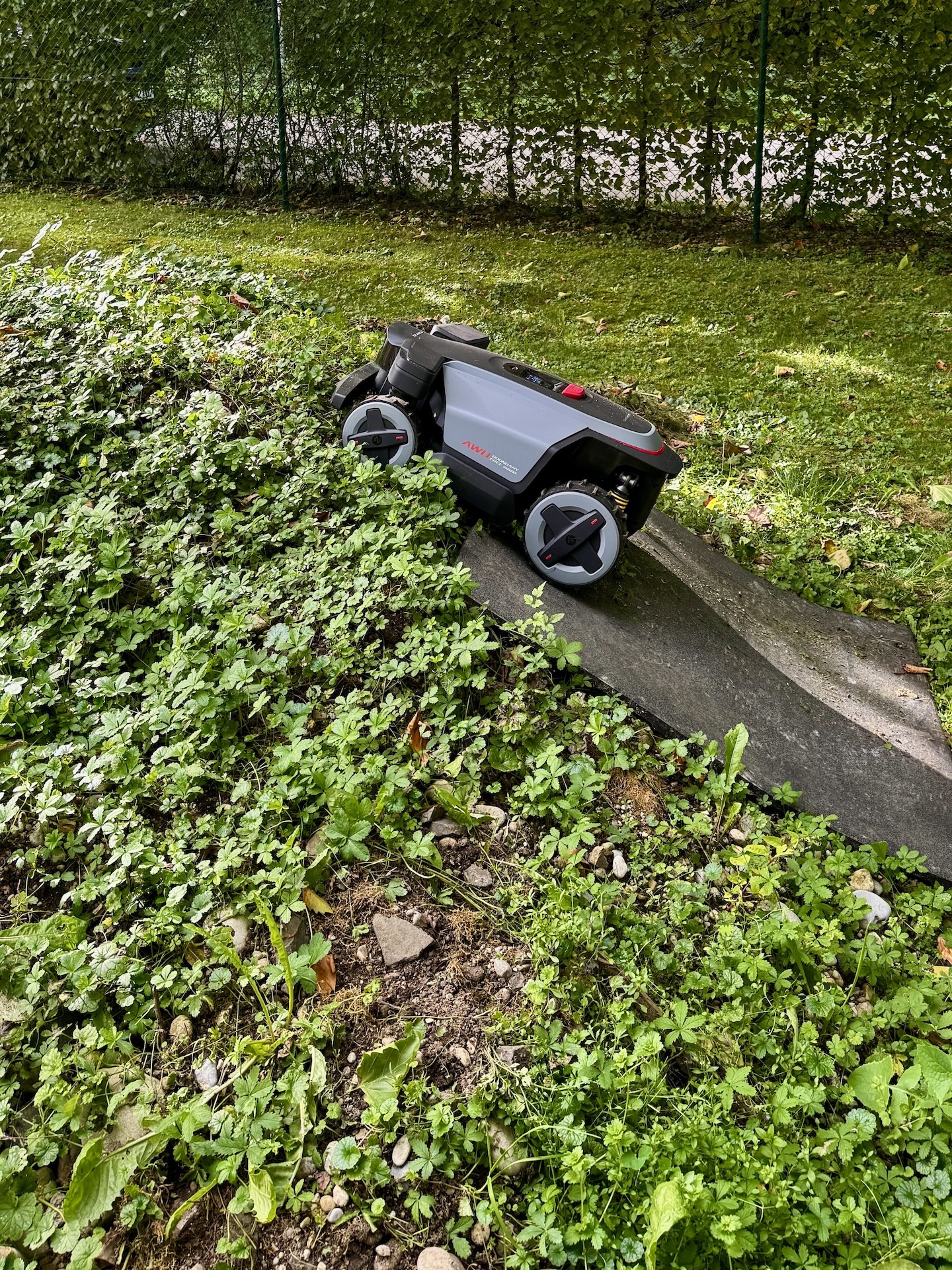 Roborock RockMow Z1 pokonał górkę z mojego zdjęcia. Zarówno w wariancie trawiastym, jak i po położeniu na niej narzut z tworzywa sztucznego. Fakt, koła buksowały i ślizgały się, ale maszyna nie wywiesiła białej flagi. Zdobyła szczyt kilka razy (skuteczność oceniam na 60 proc.), czasem robiąc przerwę w połowie wspinaczki, aby odzyskać przyczepność. Efekt był imponujący, w takich chwilach człowiek na własnej skórze czuje, jak wielki dokonuje się postęp technologiczny.