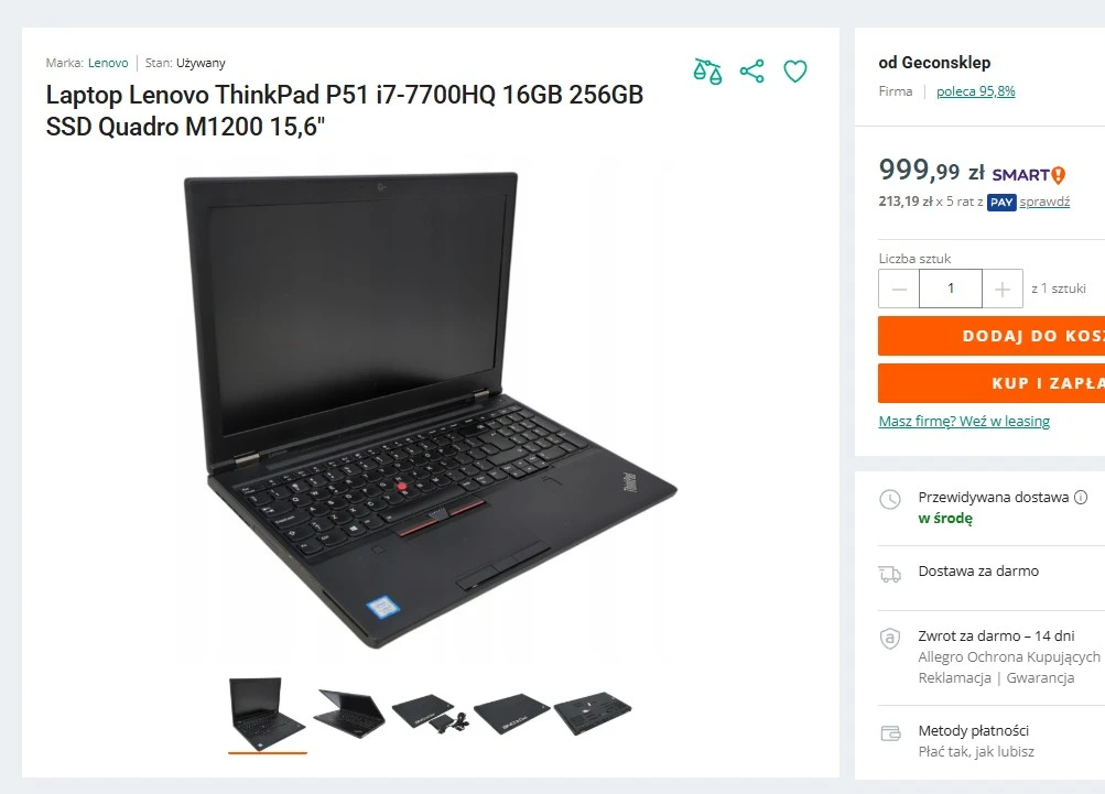 Pierwszy interesujący przykład z brzegu to ten Dell Latitude 5520 z procesorem Intel Core i5, 16 GB pamięci RAM i dyskiem SSD o pojemności 512 GB. Cena? 900 złotych. Drobny minus stanowi brak zasilacza, a większy – niezbyt dobry stan wizualny. O wiele ciekawszy będzie taki Acer Extensa 215-55 za 999 złotych, ten Lenovo ThinkPad P51 (999 zł) lub Laptop HP ProBook 450 G6 (999 zł). Każdy z nich ma 16 GB RAM, znacznie wydajniejszy procesor, a przez cały czas zainstalowany Windows 11 na pokładzie.