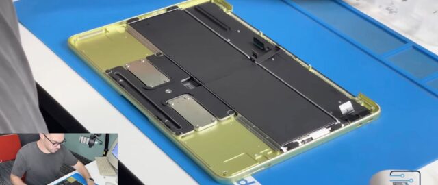 Największą niespodzianką jest sposób montażu baterii. Bateria jest przykręcona 18 śrubami, można ją po prostu wyjąć, bez specjalnych taśm czy kleju Zasadniczo w całym laptopie praktycznie nie użyto taśmy ani kleju. To pierwsza taka sytuacja w nowoczesnym MacBooku, ponieważ wcześniejsze modele często wykorzystywały klej do mocowania komponentów.